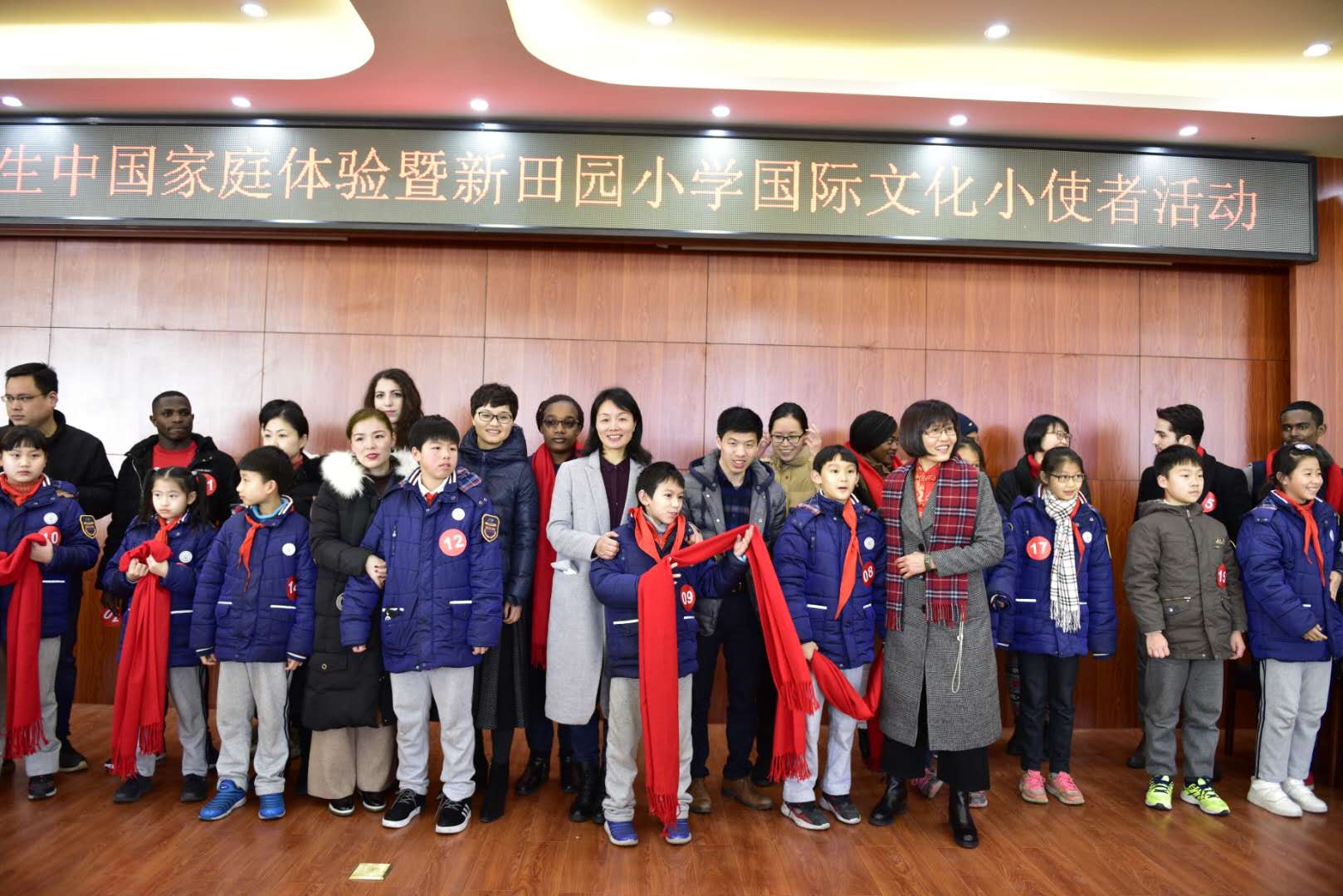 的多功能厅热闹非凡,来自尼日利亚、加纳、意大利、孟加拉等15个国家的30多名国际学生与新田园小学的30位小朋友及他们的爸爸妈妈在这里结对,组团走进温州,开展了为期一天的温州家庭体验活动。