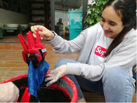 蓝夹缬工艺的操作:先将白布打湿,然后用两块木板对称夹住白布,再用夹子将木板夹住固定,最后放在染缸里进行浸染2分钟,然后拿出来让布面和空气充分接触,然后再一次浸染2分钟,拿出,等待氧化布整体变蓝,一块漂亮的蓝夹缬便完成啦!