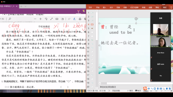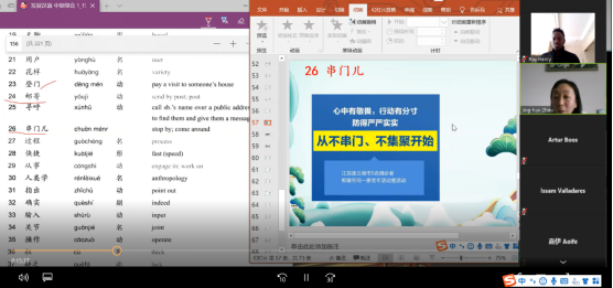 (2)打开教学PPT和电子课本,共享屏幕,正式开始课程教学。教学进行时,教师既可以在屏幕上展示PPT,也可以进行板书。一般在教师讲解过程中,要求学生静音、或保持安静,但允许学生有疑问的时候随时打开麦克风向教师发问。在教师讲解结束后,会进行造句或问答练习,根据练习的具体内容,或请学生单独发言,或是教师与单个学生交流,或令学生与学生相互交流,教师会根据具体情况明确指示学生打开或关闭麦克风。在教学过程中,老师和学生都能熟练运用ZOOM会议系统的功能,教学过程进展能够始终保持流畅,迄今尚未因技术原因产生过任何中断、未出现过任何问题。