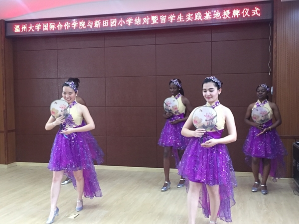 与新田园小学结对暨留学生实践基地授牌仪式”,并同新田园小学的师生一起表演欣赏了富有中国文化特色的节目,为两校进一步开展国际理解教育奠定了合作基础。