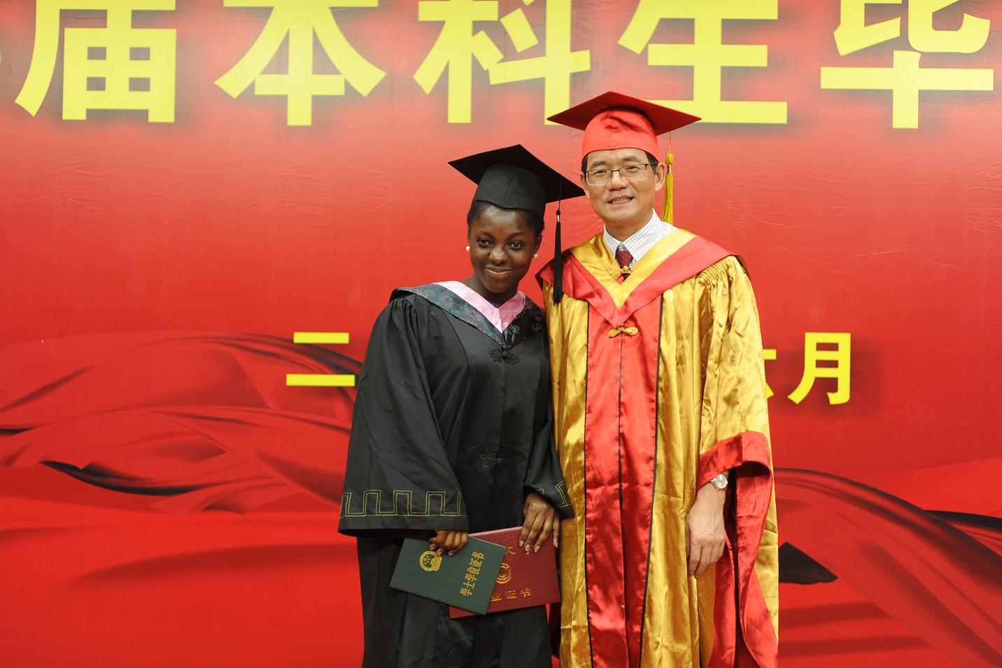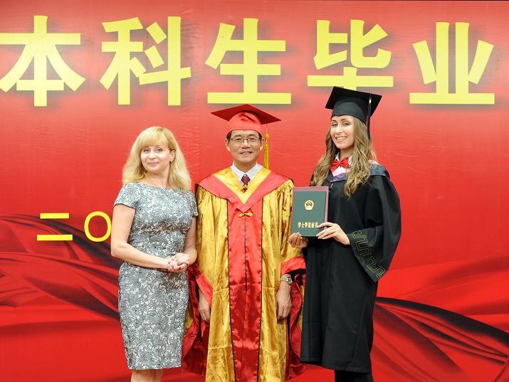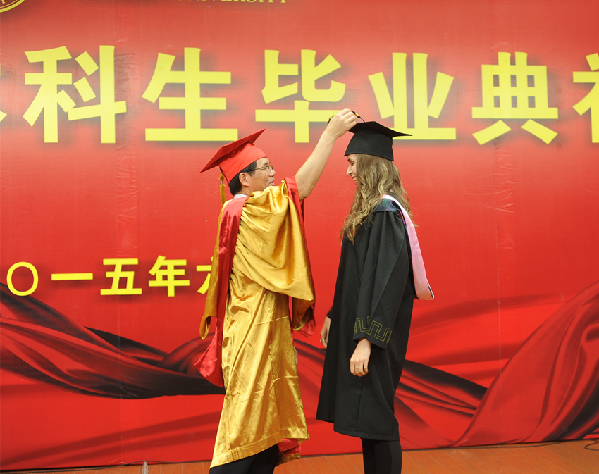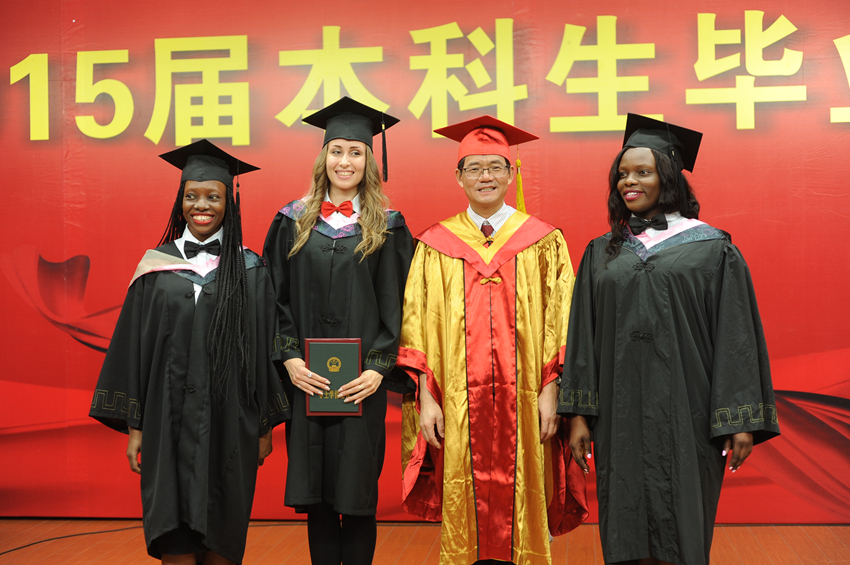 表达了对全体毕业生的祝贺,对全体老师和学生家长的衷心谢意,他殷切希望留学生们在未来的人生中能始终以全球化的视野认识世界并能成为文化交流的使者,将中国人民的友好情意带回家乡。