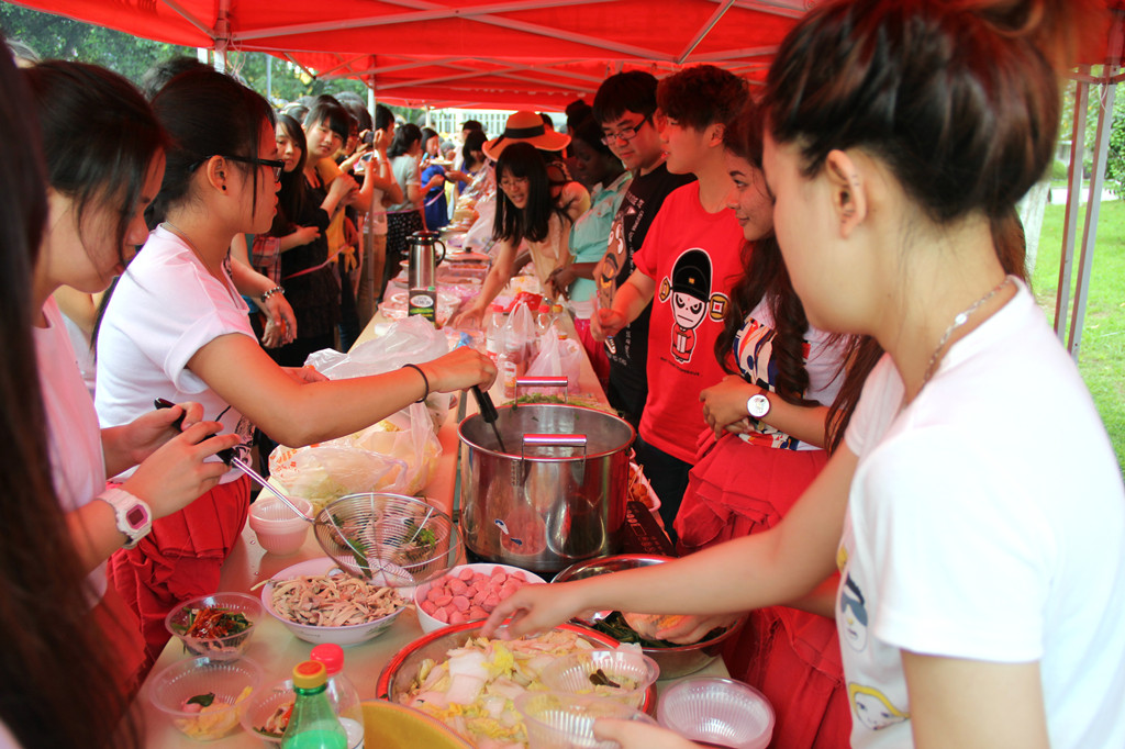 活动现场还设多国美食展区和多国知识竞答区,吸引了大量学生的参与。在美食展区,留学生们一边现场制作一边解说,泰国甜辣汤,意大利海鲜面,荷兰煎饼,南非烤肉,美国土豆泥等各国美食竞相登场,精致独特,美味可口。多国知识竞猜区,按照洲别设置了800道英文题目,同学们每答对一道题都可以领取小礼品,答完亚洲、欧洲、美洲、非洲四个区域的相应题目,还可以领取盖有18个国家纪念印章的多国文化纪念护照,得到众多同学们的积极响应。