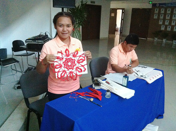 图为营员现场表演剪纸和书法