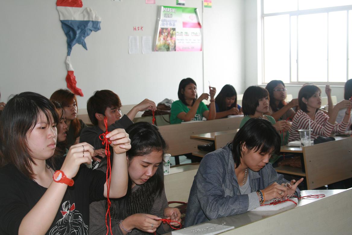 课堂上,指导老师对中国结的起源、历史意义、用途作了详细介绍,并使用PPT展示了中国编制技艺的种类及经典作品。看到一根根普通的彩线竟能编制成花样繁多的的手链、项链、中国结时,在场泰国留学生无不拍手称赞,跃跃欲试。
