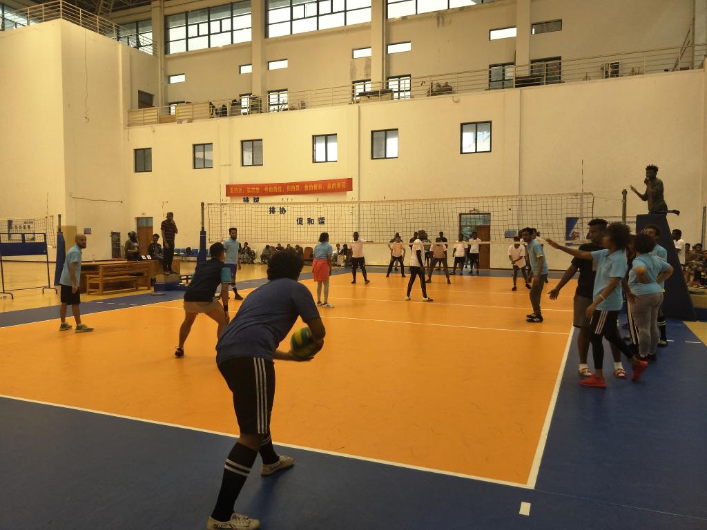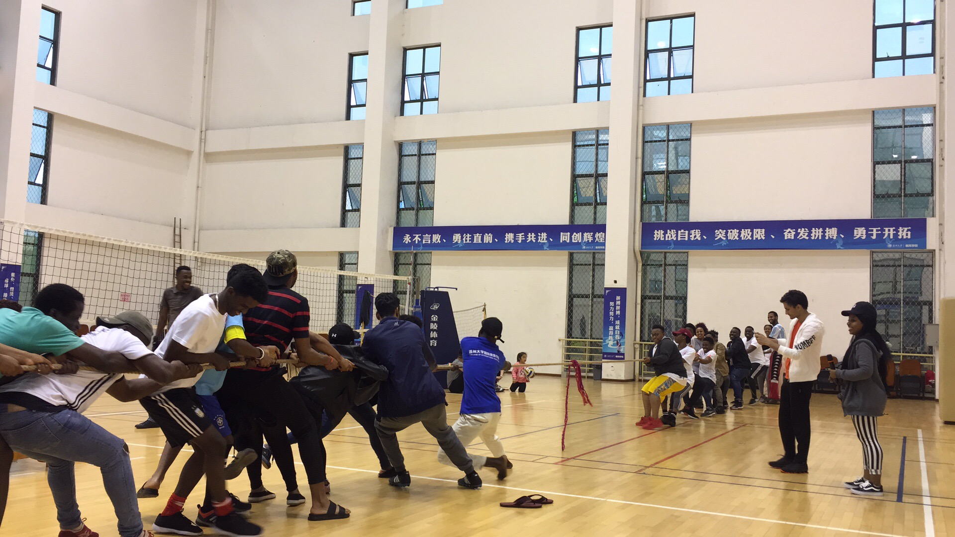 北校区体育馆内排球、篮球、趣味运动比赛也在陆续进行。裁判员一声哨响,排球赛的双方队员开始了激烈角逐,比赛进行了多个回合,时间较长,但球员们依然激情澎湃,浑然不知疲倦,场馆内各个角落都萦绕着观众为他们助威呐喊的声音。拔河比赛、套袋赛跑、乒乓球拍运鸡蛋等趣味项目是此次活动的亮点。男女学生共同参与组成了两支混合队,每组16人进行了拔河比赛,虽比赛有胜负,但增进了国际学生之间团队凝聚力,相比输赢来说友谊更显得弥足珍贵。
