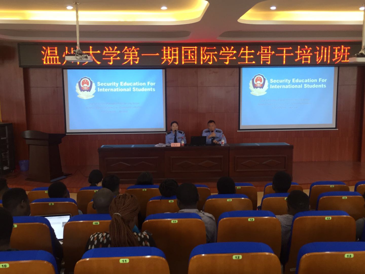 茶山高教园区派出所警官邱丽斌、周陈怡人分别作有关人身、财产和交通安全方面的专题辅导。两位警官结合案例和制度,通报了国际学生日常生活中存在的安全隐患,要求国际学生在日常生活中提高防范意识,切实保障自身的人身安全和财产安全。