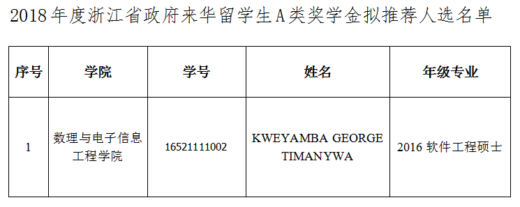 进修生BIRIMUMAASO RAYMOND HENRY等5名同学为2018年度浙江省政府来华留学生C类奖学金人选,现将拟推荐人选名单予以公示。