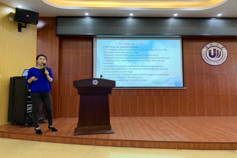 和社会的稳定。我国对待毒品是零容忍的态度,国际学生在中国应当遵守中国的法律法规,而不应心存侥幸。在最好的年纪应当将时间和精力放在学业上,这样才有光明的未来。讲座结束前安排有测试环节,现场学生均能根据讲座内容正确回答相关问题,达到了预期效果。