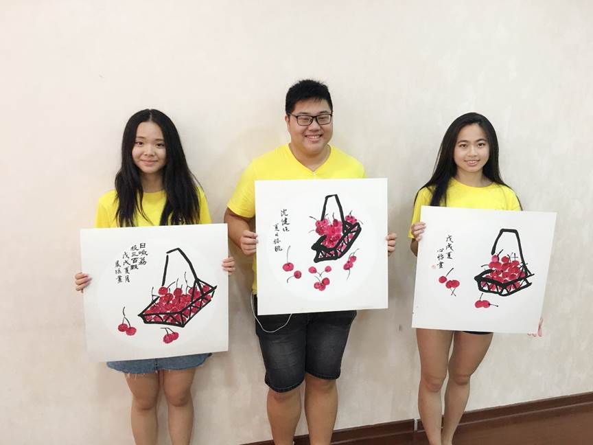 课程的后半部分,是营员们提笔绘画的时间。在此之前,程老师先跟大家介绍了绘画需要用到的工具“文房四宝”,即笔、墨、纸、砚。在大家都准备好工具后,程老师向大家讲解了如何调色、构图、落笔,接下来,就到了营员们动笔的时刻了。程老师给大家的展示的是荔枝,营员们根据这幅画临摹或者自由发挥,程老师则在一旁耐心指导。每一位营员都兴致高昂,认真投入,完成了非常好的作品。程老师还为完成作品的同学签了名,盖了印章,表示鼓励赞赏。