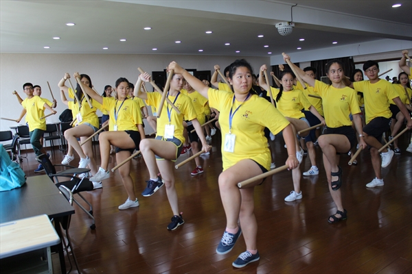 木权通、黄加俊、夏柳妹三位老师身着黑色中式武术服, 一身正气,而翁璋峰老师则穿了白色的习武服,显得轻质飘逸。几位老师一进场先给营员展示了气势磅礴、浑厚有劲的五祖拳和棍法,赢得营员们的阵阵掌声。