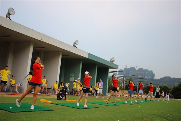 来到练习场地,首先由教练为大家讲解打高尔夫球的基本要领和注意事项,从站姿、握杆、挥杆到击球,营员们仔细观察者教练的一招一式,尝试着去模仿。正式开始练习,按照教练的指导营员们认真地练习,教练在一旁观察,并指导。一次次地练习,很快不少营员开始找到感觉,从碰不到球到挥出精彩的一杆,大家都一致叫好,为队友的进步而喝彩,尽情享受球场上挥杆的快乐与成就感。