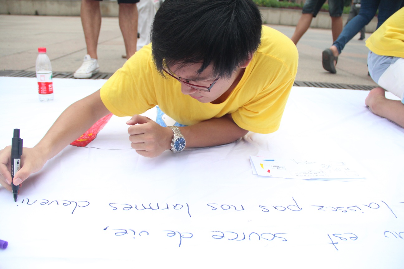 为了提高优秀华裔青年“五水共治”的活动参与度,营员们一一在活动宣传横幅上签字。随后的快闪活动也吸引了广场上不少的人流前来关注此次公益活动。来自不同国家的营员分别用不同的语言向大家展示了自己的治水决心。在随后的宣传海报制作活动中,大家绘画了不同的国家的国旗、国徽、环保宣传标语,形形色色的国旗、标语组成一幅巨型宣传海报也为此次的公益宣传活动画下了圆满的句点。活动结束后,营员们纷纷表示在大家的共同努力下,一个青山绿水的江南水乡一定会重新展现在我面前。