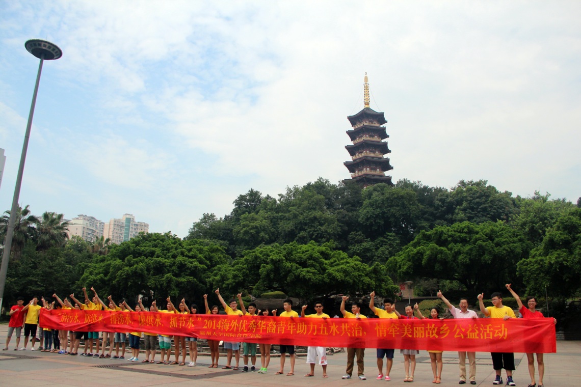 水是万物生长的甘露,是我们生命的源泉。7月15日,为了响应温州市政府“五水共治”的总体号召,加强华裔青年对祖国环境和山水的认同感,以实际行动参与保护温州母亲河,共建祖国美好家园,中国“寻根之旅”优秀华裔青年营——“相约温州营”在松台广场开展五水共治公益活动。