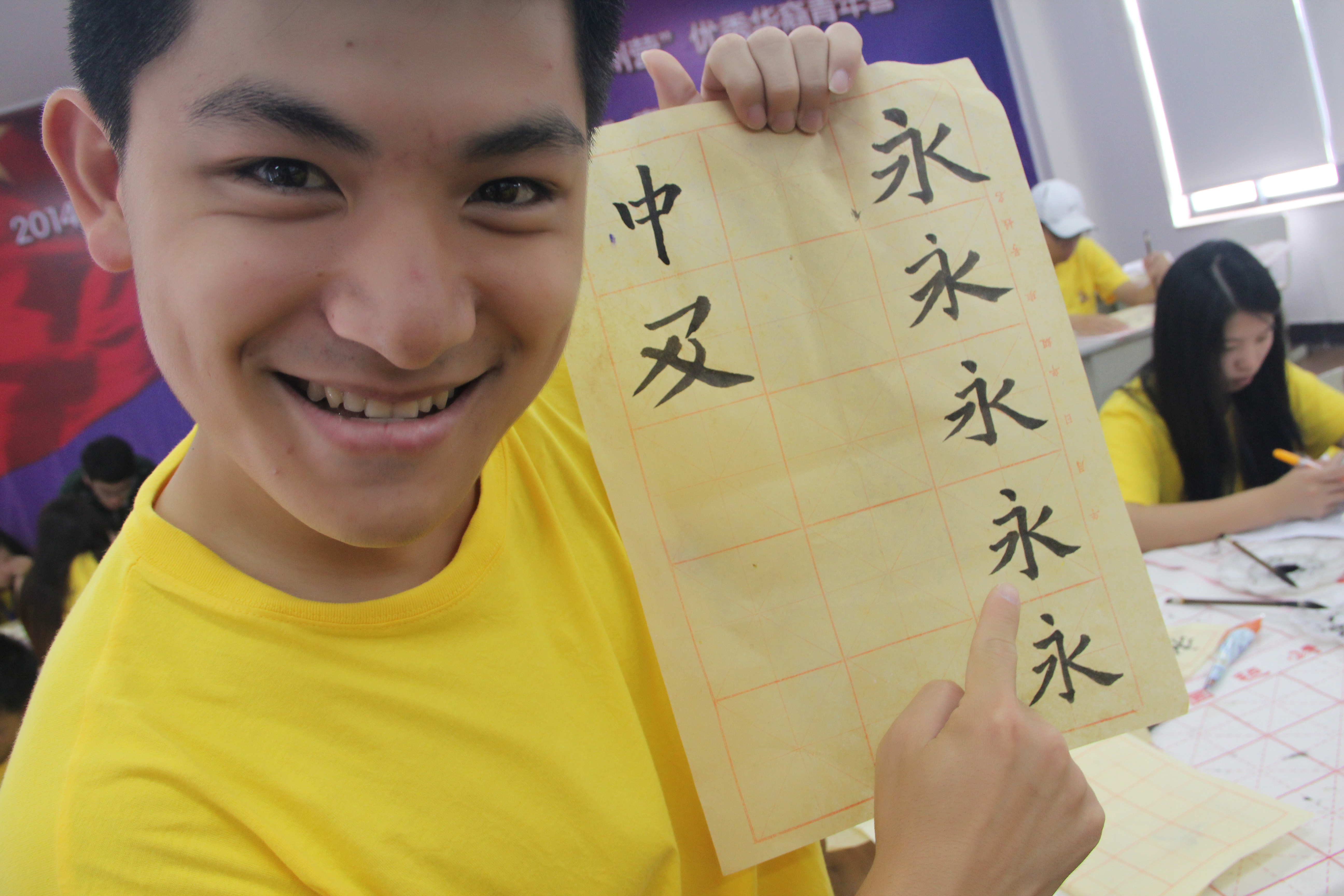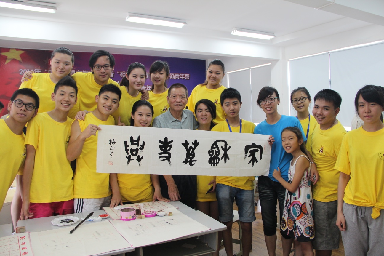 在书法实践课上,石峰老师首先教营员们练习最基础的“永”字,要求营员们练好每一个笔画。通过示范、模仿和自我练习,营员们从一开始的略微埋怨到最后耐心地将该字写得越来越好。本届青年营的论坛主题为“中国梦,故乡情”,营员们在石老师的指导下书写这六个大字,寄寓论坛成功举行。当完成这幅书法作品时,很多人表示自己从来没花那么多时间就写六个字,不过也确实感悟到了书法的魅力。他们举着自己创作的”中国梦,故乡情“纷纷合影留念。