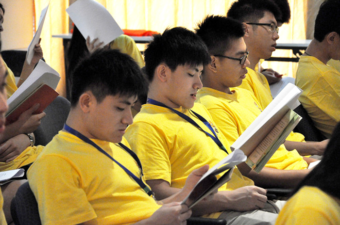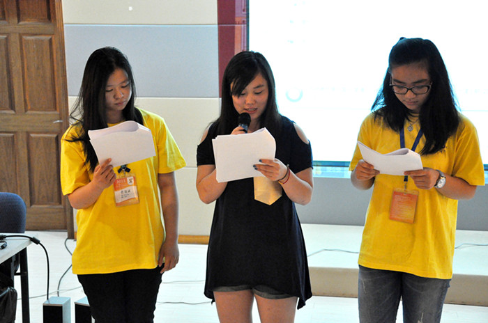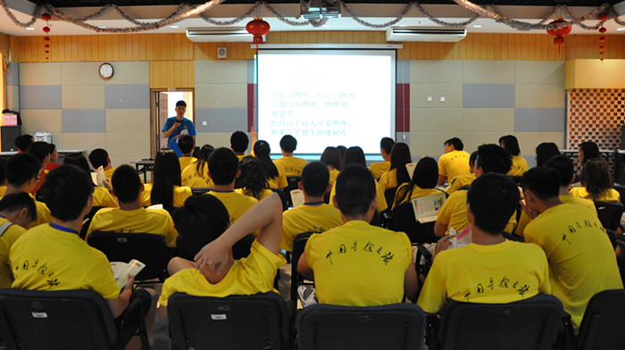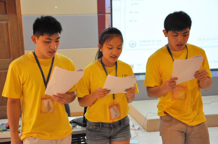 留学生楼多功能大厅传出阵阵温州方言版的童谣诵读声,2013“中国寻根之旅”华裔青年营的营员们人手一本《温州童谣》,在老师的带领下,且读且唱,一板一眼,带着葡萄牙语、意大利语、荷兰语、法语、日语等口音的洋腔洋调将温州经典童谣《叮叮当》读出了国际味。