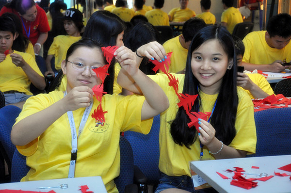 一张红纸,一把剪刀,跟着老师详细的讲解和示范,每一位营员都裁剪出了自己的剪纸作品。看着一张张普普通通的红纸在手中变成精美的艺术品,营员们充满了成就感,几位来自意大利的营员表示,等回到了意大利,要好好在朋友面前秀一秀自己的剪纸技术。