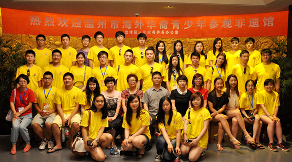 7月23日上午,2013“中国寻根之旅”相约温州营优秀华裔青年营的营员们来到位于龙湾区的温州市非物质文化遗产博物馆,参观温州“非遗”最精华的部分。此次活动受到了市、区领导的重视,市侨办副主任许捷、龙湾区人民政府副区长朱大志、市侨办党组成员叶斌斌、龙湾区侨办主任、侨联主席陶彩霞等一同参加了此次活动。朱大志副区长致欢迎辞。