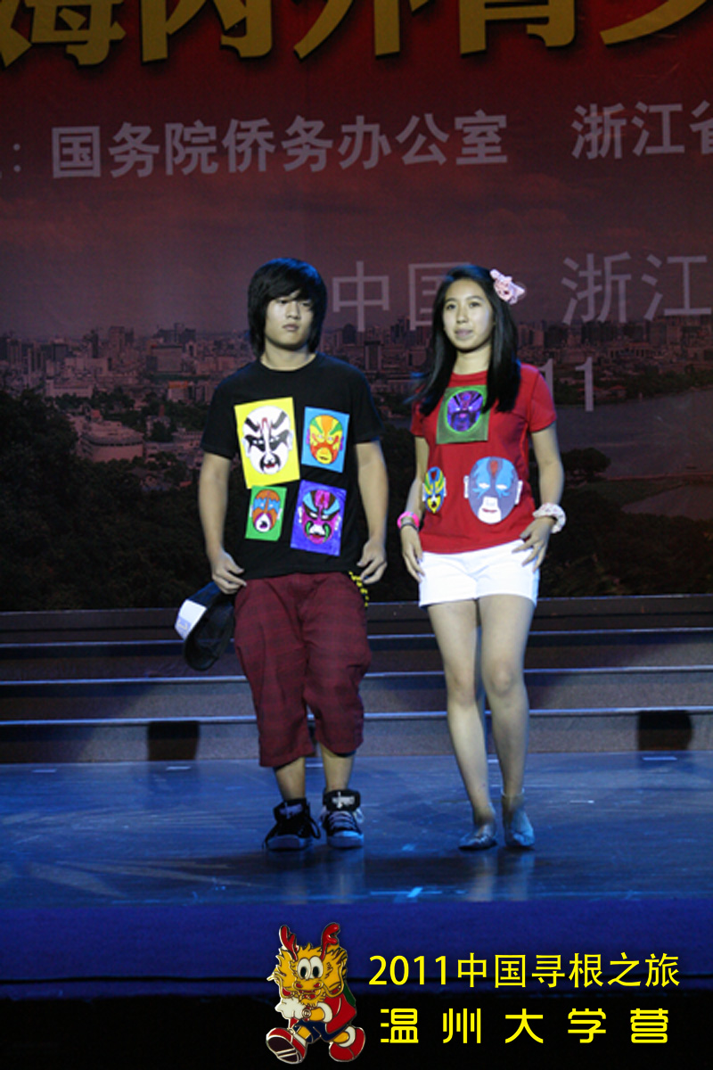 在联欢活动上,温大营员表演的服装走秀节目《中国风》,所表现浓厚的中华文化底蕴,深深感染了在场的每个人,赢得了阵阵掌声。本次服装秀以中国风为主线,在日常的服装之上通过绘画,剪裁,黏贴等各种方法融入了如国画、龙凤、书法等传统而且历史悠久的中国元素。很多服装都使用较为简单的方法将现代的时尚与古典的优雅恰当融合,其中各种添加元素的制作均为营员在老师的指导下独立完成,让本次参加夏令营的营员既有个性又富有中国风。