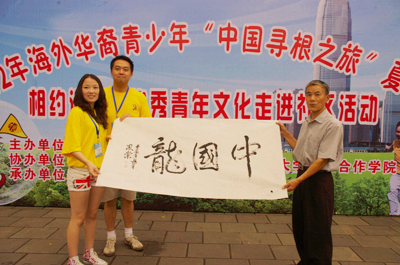 老年书法家现场为大家展示中国书法,老书法家挥毫写下“中国龙”苍劲有力的大字,引得大家大声喝彩。营员们很多在国外学过书法,急忙向老先生请教,迫不及待地要大显身手。有些第一次写毛笔字的营员也急切地拿起毛笔想要试一试中国古人怎样写字。大家写毛笔字写得兴致浓厚,手上沾满了墨汁还特别开心!老书法家将自己写的作品送给了营员,营员视若珍宝,说回家后要送给家里的爷爷奶奶,因为他们很喜爱祖国传承了千年的书法。