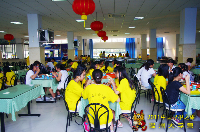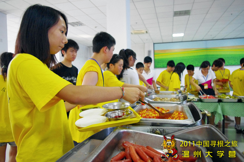 为了尽可能地照顾这些海外华裔的青少年们的饮食习惯,温大营地的工作人员独具匠心,采用以自助餐的形式,中西合璧。既有可口的中式菜肴,又有西式的薯条、鸡块。同时,餐厅还配置西瓜、哈密瓜、香瓜、梨、苹果等多种营养水果,荤素搭配,营养丰富。