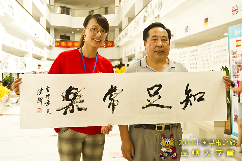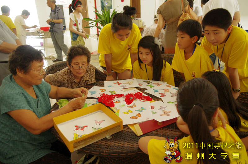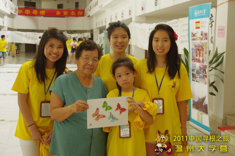 7月22日上午,温州市老年书法协会30多名退休老干部来到2011海外华裔青少年“中国寻根之旅”夏令营温州营温大分营的营地,对海外华裔青少年们进行书画展览和现场书画创作展示,让营员们感受到中国传统书画艺术的魅力。到场的除了营地85名海外华裔青少年,还有20多名海外华校教师培训班的学员们。