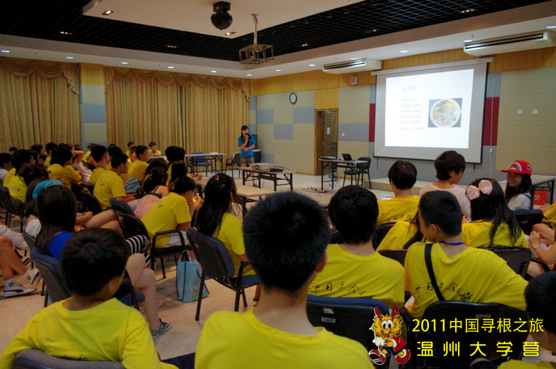 温州童谣起源于明清时代,流传广泛,传唱至今,不仅有着丰富的民俗风情,而且还寓教于乐,趣味盎然。它用朗朗上口的语句,给我们讲述了一个个故事,一个个做人的道理。在座的85名海外华裔青少年们,在廖老师趣味的童谣课上,营员们跟着老师一起哼着自己的乡音童谣。《送松糕》、《吃混沌》、《十二月令》、《叮叮当》一首首温州特色童谣把营员们带入了故乡的奇幻之旅中去。