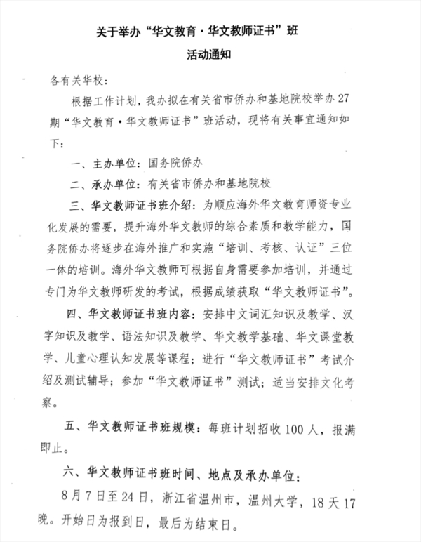 华文教师证书班由国务院侨务办公室主办,省市政府侨务办公室承办,在基地院校培训。同时,国务院侨办将逐步在海外推广和实施“培训、考核、认证”三位一体的培训。海外华文教师可根据自身需要参加培训,并通过专门为华文教师研发的考试,根据成绩获取“华文教师证书”。