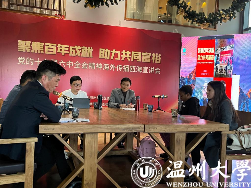 葡萄牙籍留学生陈梦瑶、尼日利亚籍留学生金微微作为留学生代表参加了在瓯海区丽岙街道五社村文化礼堂举办的党的十九届六中全会精神海外传播瓯海宣讲会。本次宣讲会由瓯海区委宣传部举办,以直播的方式进行。全场共吸引了33万海内外华人华侨收看。