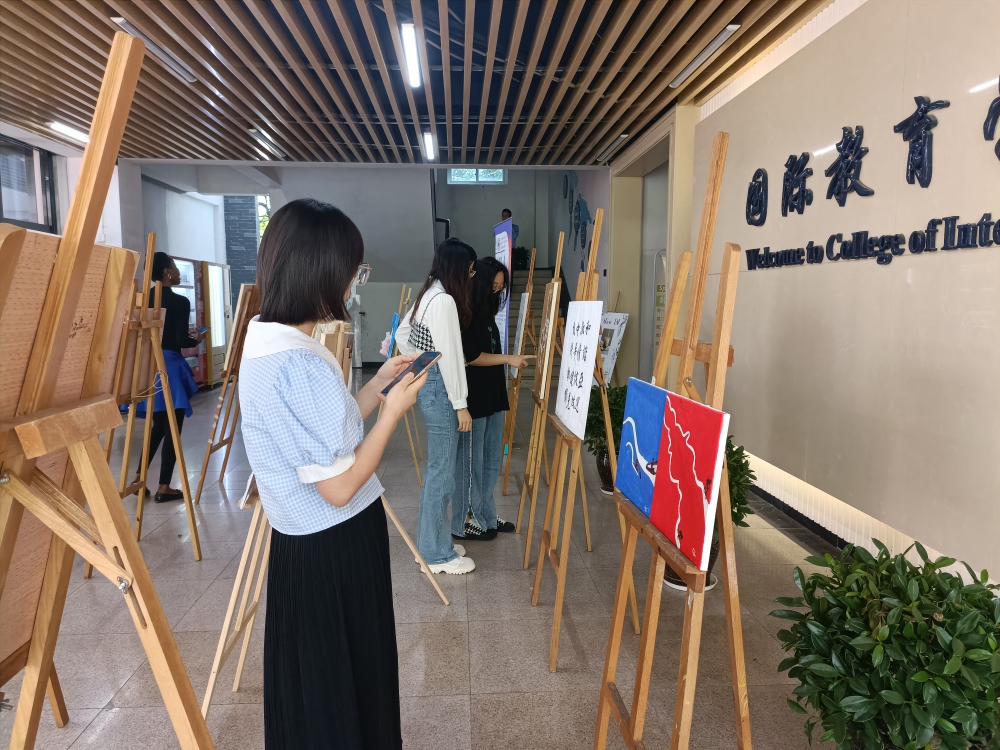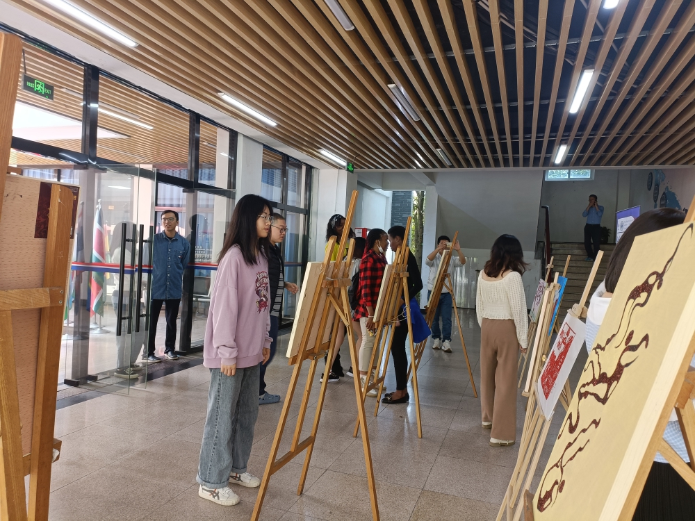 拉开帷幕,近20件由外国留学生创作的充满亚运元素的作品依次排开,吸引不少在校师生前来观赏。