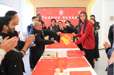 与茶山派出所共同举办了以“笔墨辞旧岁,书法贺新春”为主题的特色活动。活动现场,墨香四溢。在专业书法老师的指导下,留学生们兴致勃勃地拿起毛笔,蘸满浓墨,一笔一划地书写着“福”字和春联。他们虽然初涉书法,但每个人都全神贯注,力求将每一个字都写得工整美观。写完后,他们还纷纷展示自己的作品,脸上洋溢着满足和喜悦的笑容。活动后来自乌兹别克斯坦的留学生娜美感慨的说:“春联上的每一个字都蕴含着吉祥和美好的寓意,这让我深刻体会到了中国人对和谐、好运的追求。这次体验让我更加热爱中国文化了。”