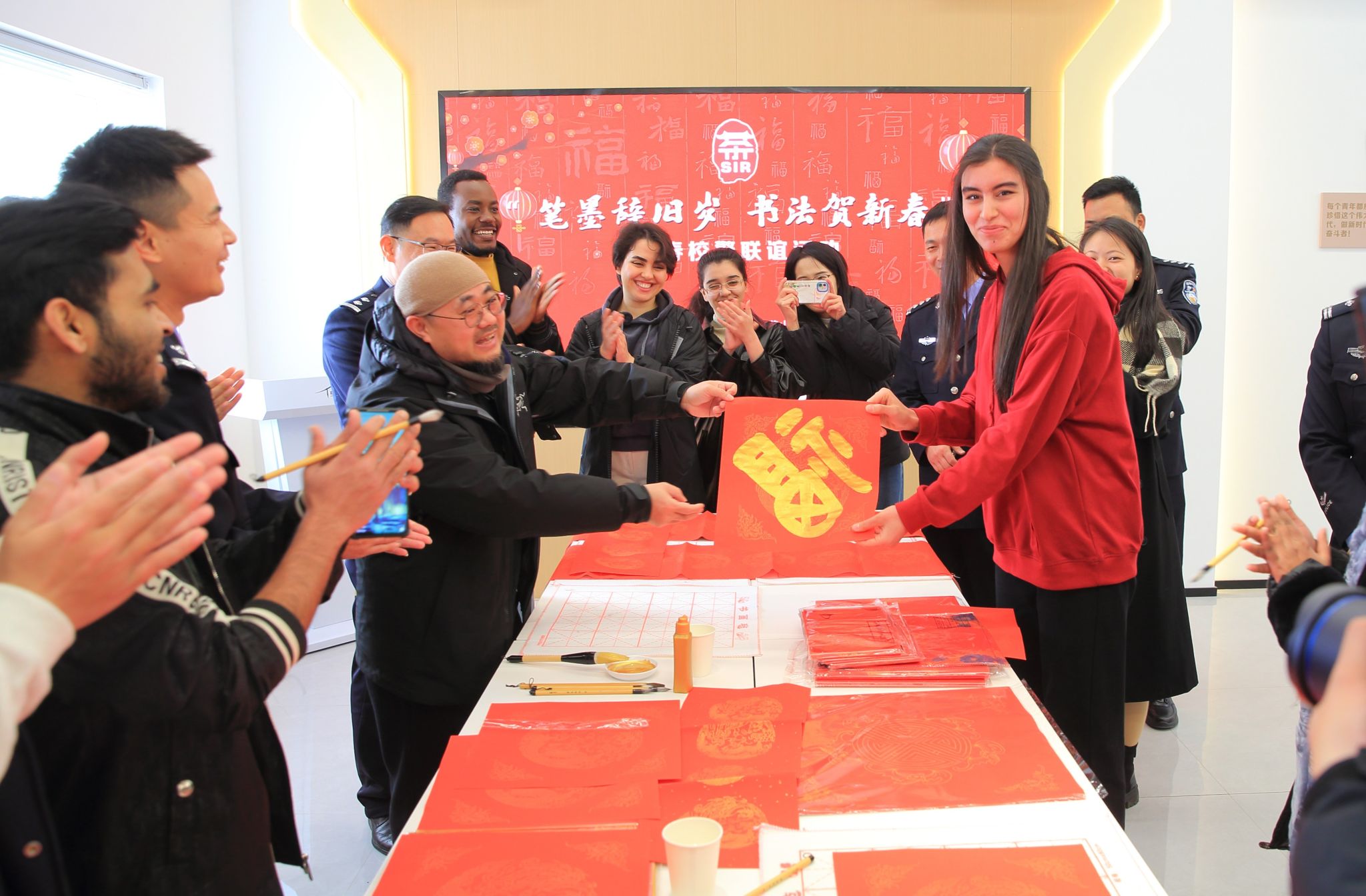 与茶山派出所共同举办了以“笔墨辞旧岁,书法贺新春”为主题的特色活动。活动现场,墨香四溢。在专业书法老师的指导下,留学生们兴致勃勃地拿起毛笔,蘸满浓墨,一笔一划地书写着“福”字和春联。他们虽然初涉书法,但每个人都全神贯注,力求将每一个字都写得工整美观。来自乌兹别克斯坦的留学生娜美感慨地说:“春联上的每一个字都蕴含着吉祥和美好的寓意,这让我深刻体会到了中国人对和谐、好运的追求,这次体验让我更加热爱中国文化了。”