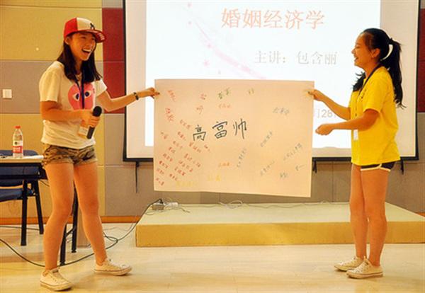 热场互动让营员们对择偶、爱情和婚姻的话题产生了浓厚的兴趣,包老师借此还与来自世界各个不同国家的营员们共同探讨他们侨居国的爱情观和婚姻观,从而引导营员们进入今天的主题——婚姻经济学。包老师从婚姻经济学的起源和背景、婚姻与供求、婚姻与效用、婚姻与市场、婚姻中的成本和收益分析、婚姻的风险分析六大方面进行阐述,解析稳固、高效婚姻的成功要素。最后,包老师以一个经典案例:“我怎样才能嫁给有钱人?”告诉营员们,最好的投资是自我增值,大家还有很长一段时间可以努力,来增加自己的可保值、增值的资产。