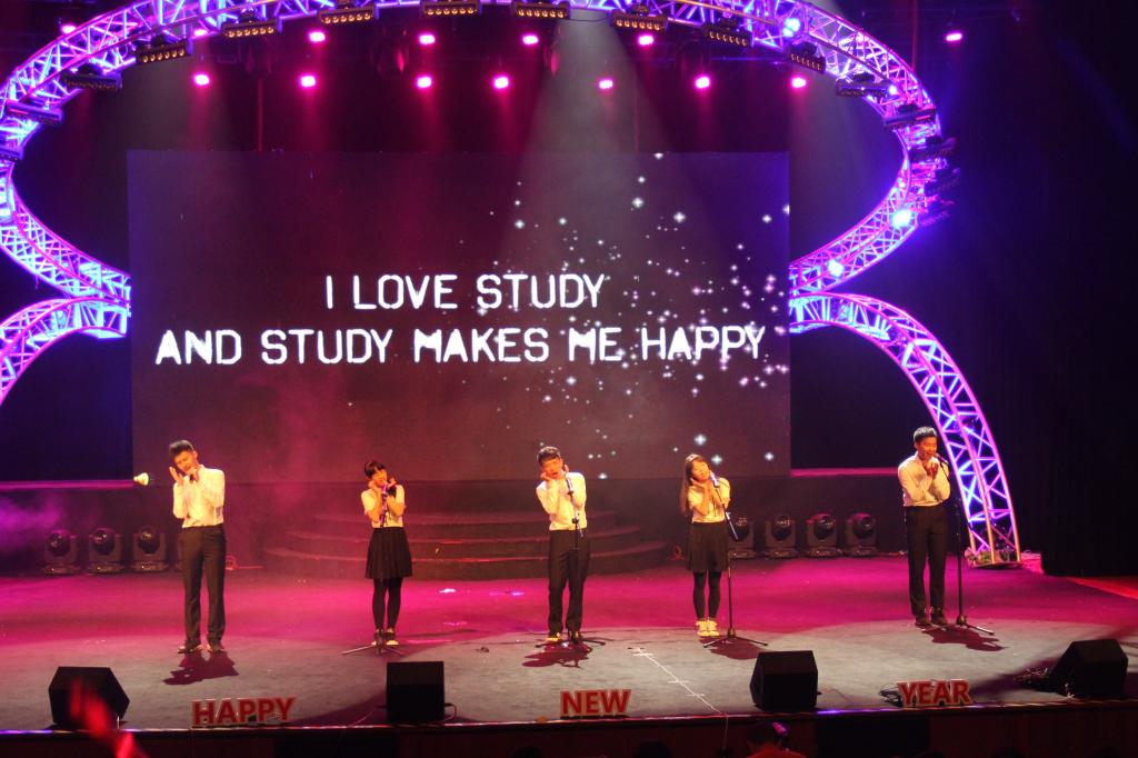 2018年中外学生新年联欢晚会在大学生活动中心的育英大礼堂隆重举行。副校长、党委委员蔡曙光,国际交流与合作处处长严晓鹏,校党委学工部副部长高红星,校团委副书记魏一,溯初学区党委副书记章志图,人文区块链游戏
