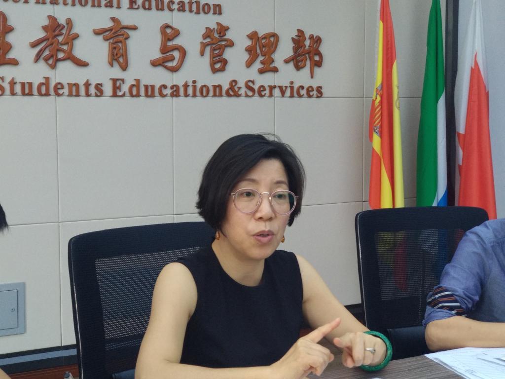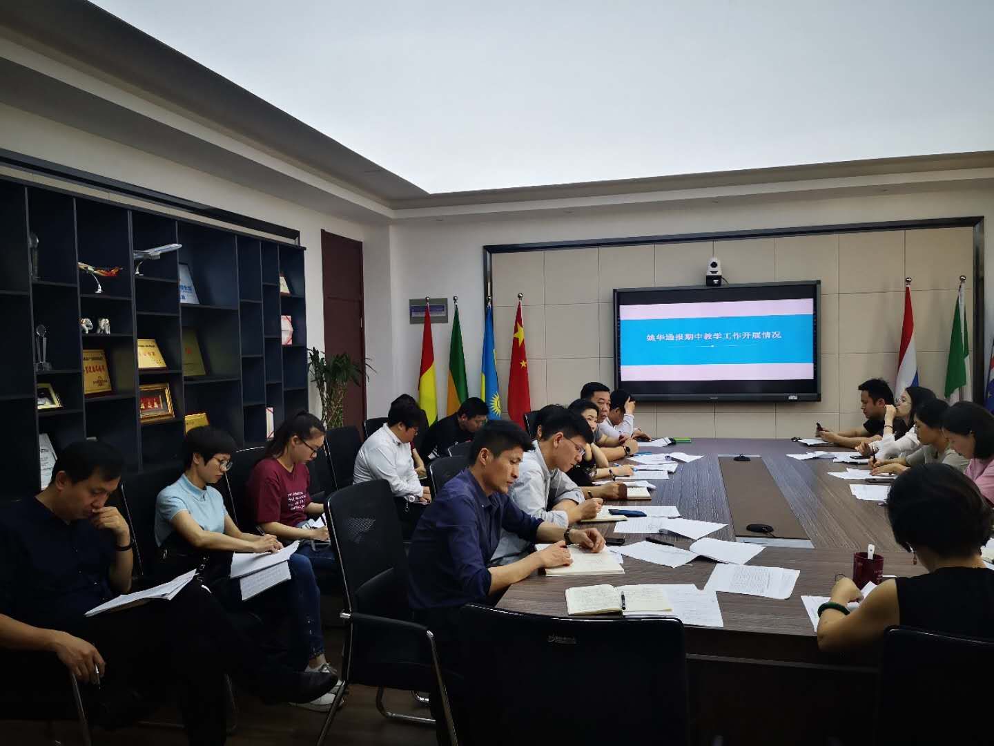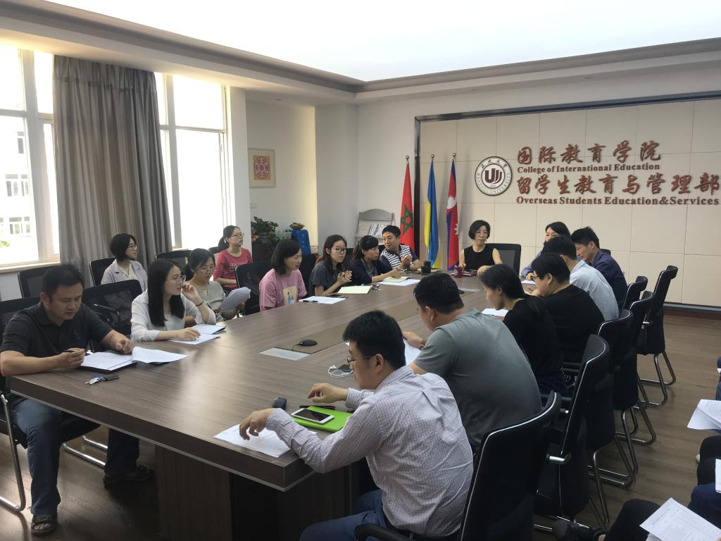 会上,陈文远作近期国际学生社区舆情通报。她从课堂考勤、行为表现、安全教育、文明寝室检查、校内外住宿管理、居留许可办理等方面通报了近段时间开展的主要工作和存在的安全隐患,布置了国际学生重要舆情定期通报以及本研国际毕业生的典礼、校友、档案和安全离校工作。姚华结合国际学生的学习成绩、学业预警、毕业审核、培养方案等方面反馈了期中教学工作检查情况。学生科副科长谢坚就国际学生综合素质中期测评工作的目的、具体操作流程和有关注意事项等内容进行了说明。