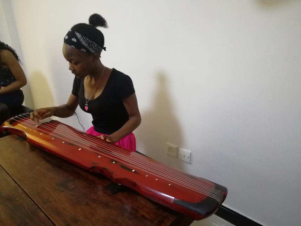 学生们按捺住激动的心,听蔡老师讲解了古琴的基本指法和演奏技巧。随后,蔡老师手把手教学生练习经典曲目《沧海一声笑》,一时间,琴声潺潺,余音悠远,此起彼伏的琴音似乎把人带到了遥远的时空。在多次尝试与反复练习后,大多数学生迅速掌握了古琴的基本指法,有两位加纳的女生还能非常流畅地弹奏了该曲目,博得同学们的阵阵掌声。
