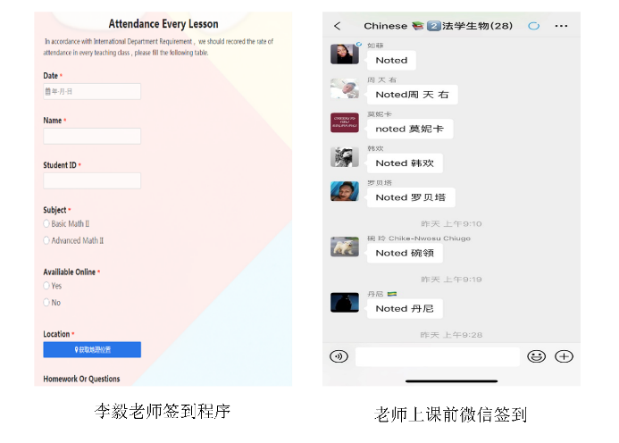 共有学历国际学生600多人,为保障国际学生教学质量,任课教师们使尽浑身解数解决线上教学遇到的种种问题。例如,高等数学课程李毅老师,为学生们设计了签到小程序,可以自动获取学生地理位置,便于实时掌握学生的位置。除此之外,教师们还采用了符合国际学生使用习惯Zoom作为主要教学平台,结合微信作为签到、发放通知以及留言答疑的平台。