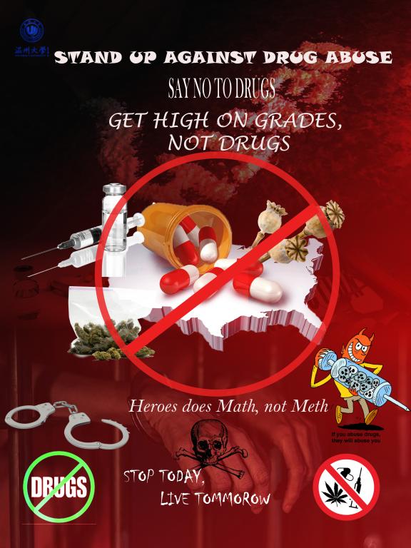 一等奖获得者SALUM FAHMI HAROUB同学说,在他的家乡有很多家人和朋友因为毒品失去了生命,失去了未来,这一方面使他害怕毒品,另一方面促使他鼓起勇气,运用自己绘画的特长来制作警示海报,提醒人们远离毒品。“我觉得对于学生来说,毒品就像是慢性毒药,不仅可以导致死亡还会摧毁一个家庭。因此我们要远离毒品,因为优秀的学生需要健康的心灵,而健康的心灵是没有毒品的心灵。”