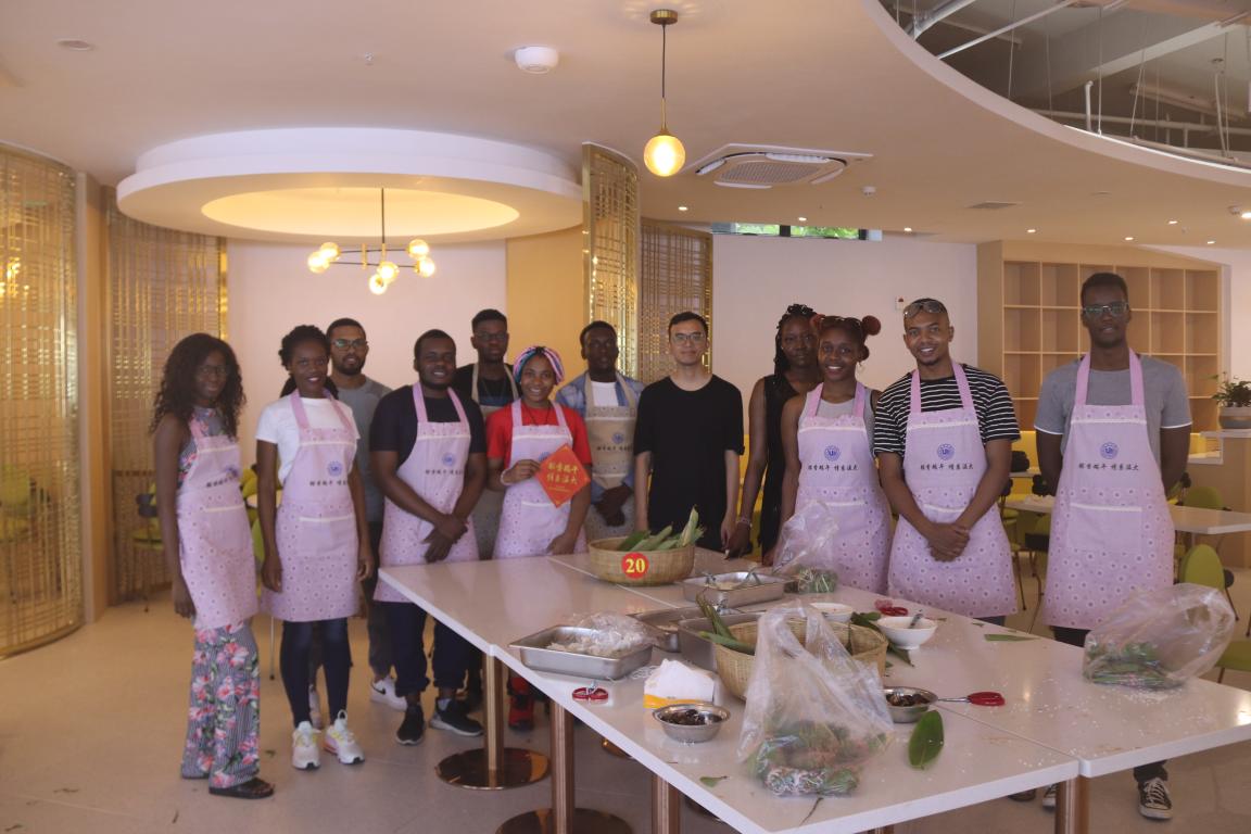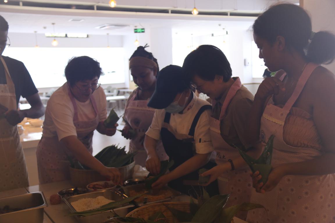 的领导和老师细心教他们包粽子。虽然一些留学生刚开始还不懂得要领,但是随着一个又一个粽子出炉,他们的手法也渐渐娴熟起来。
