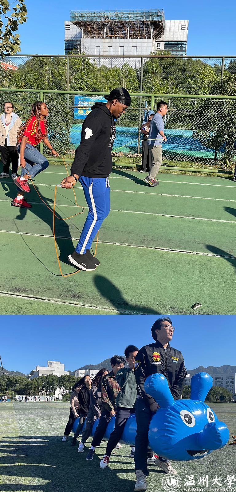 运动会现场热闹非凡,师生们积极参与。在车轮滚滚项目中,师生队伍各展身手,一次次欢声笑语将气氛推向高潮;毛毛虫竞速中,参加选手互相配合,在体验游戏乐趣的同时,用属于自己的方式你追我赶,脚步踉跄却奋勇争先,取得了良好的效果。乒乓球运球竞速的活动让留学生再一次感受到了国球乒乓的神奇和中国学生对于乒乓球的熟练,彼此交流游戏技巧和比赛心得。