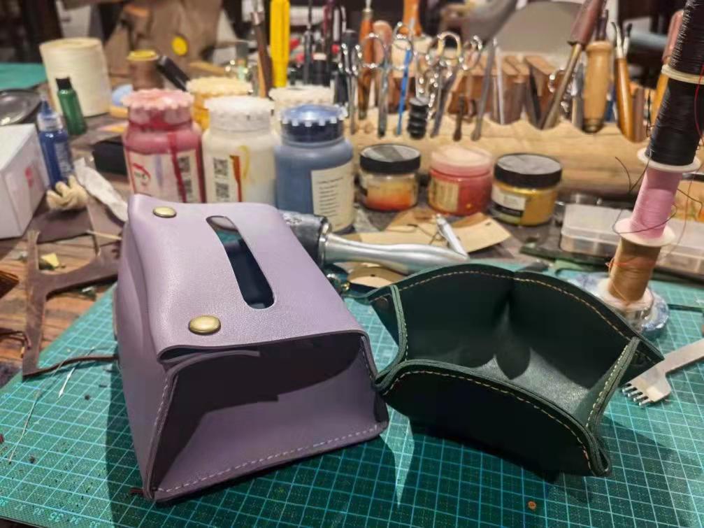 走进优雅的山根小村,沾染愉悦的节日气氛,进入店铺的各位老师迅速地选定了制作的样品和挑选了喜爱的皮料。在学习了皮具的基础制作方法之后,大家纷纷动手开始制作自己的作品,即使是普通的皮料甚至是废弃的边角料,也在一阵阵敲打和缝制中变成了各种实用的生活小物,例如各色的卡包、花瓣形糖果盒、面巾纸收纳盒和造型钥匙串等,可见再平凡的材料加以匠心巧手,亦能散发出无限魅力。