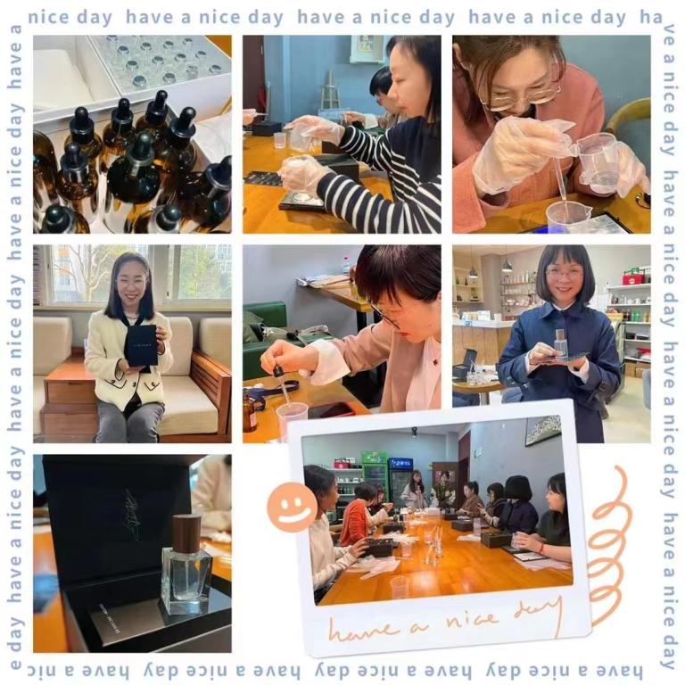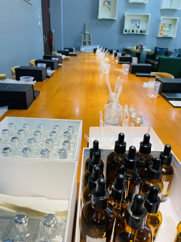 咖啡吧。负责人早早准备好了基础的香精和试管滴剂,并准备了精美的包装盒和卡片,来方便记录调香的灵感和各阶段基调。负责老师发表完简单温馨的妇女节祝词后,又耐心的对调香流程进行了讲解和安全操作提示,引导大家定制属于自己的香韵。活动开始,师生们纷纷开始选择能构成香味主题和结构的香韵和成分,为香水取名,调试能诠释自我风格的前调、中调和尾调。