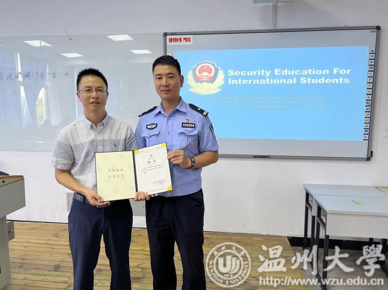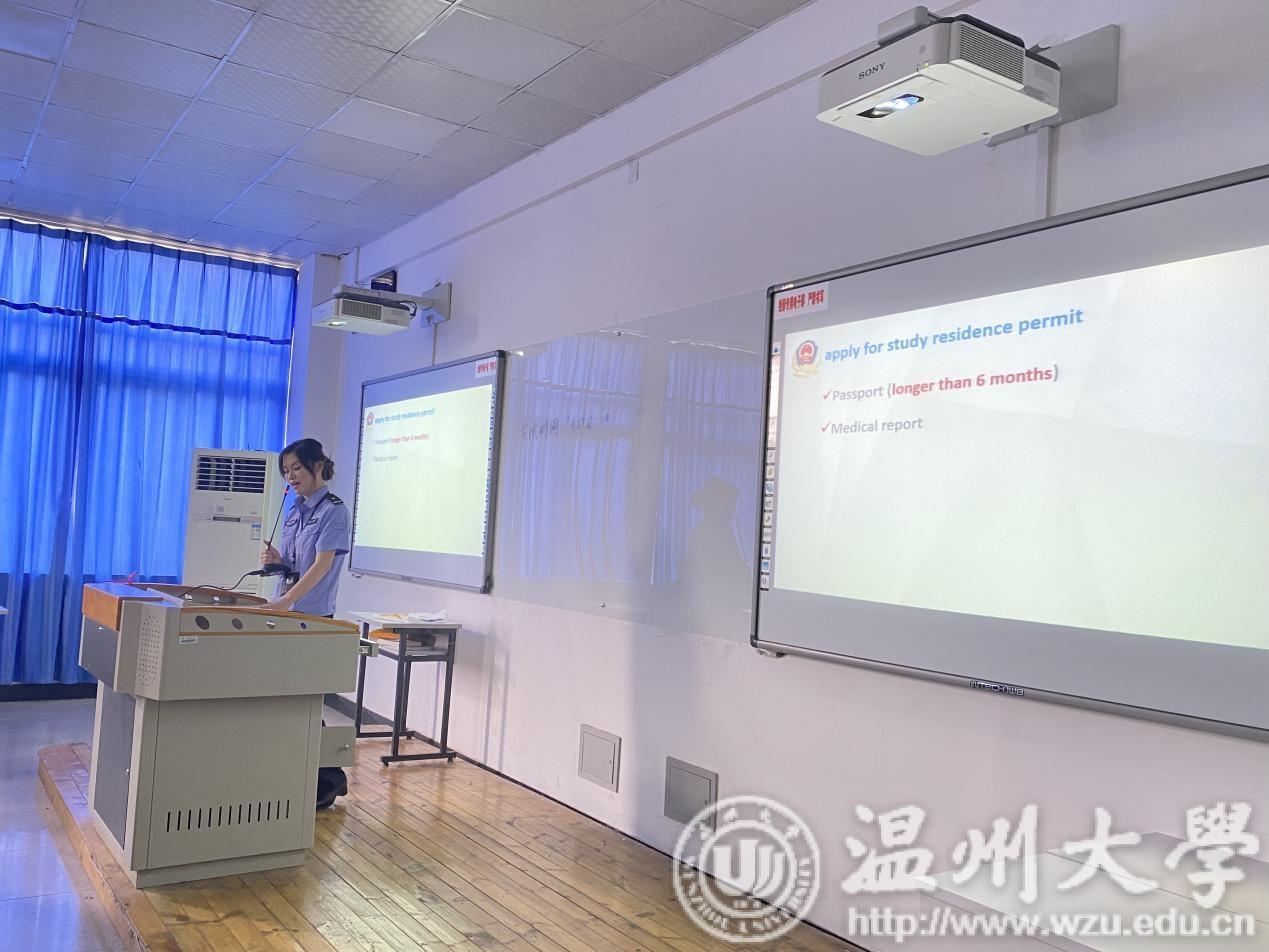 特邀温州市公安局瓯海区分局茶山派出所陈海敏、胡亦舒警官进行中国法律、安全、禁毒、反诈骗讲座,以及瓯海区公安分局出入境张小雯警官进行签证办理讲解。一个个鲜活的典型案例给留学生们敲响遵纪守法的“警钟”,让守法观念和安全意识更加深入人心。