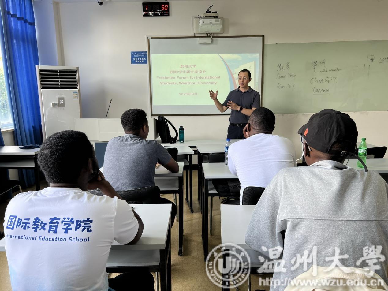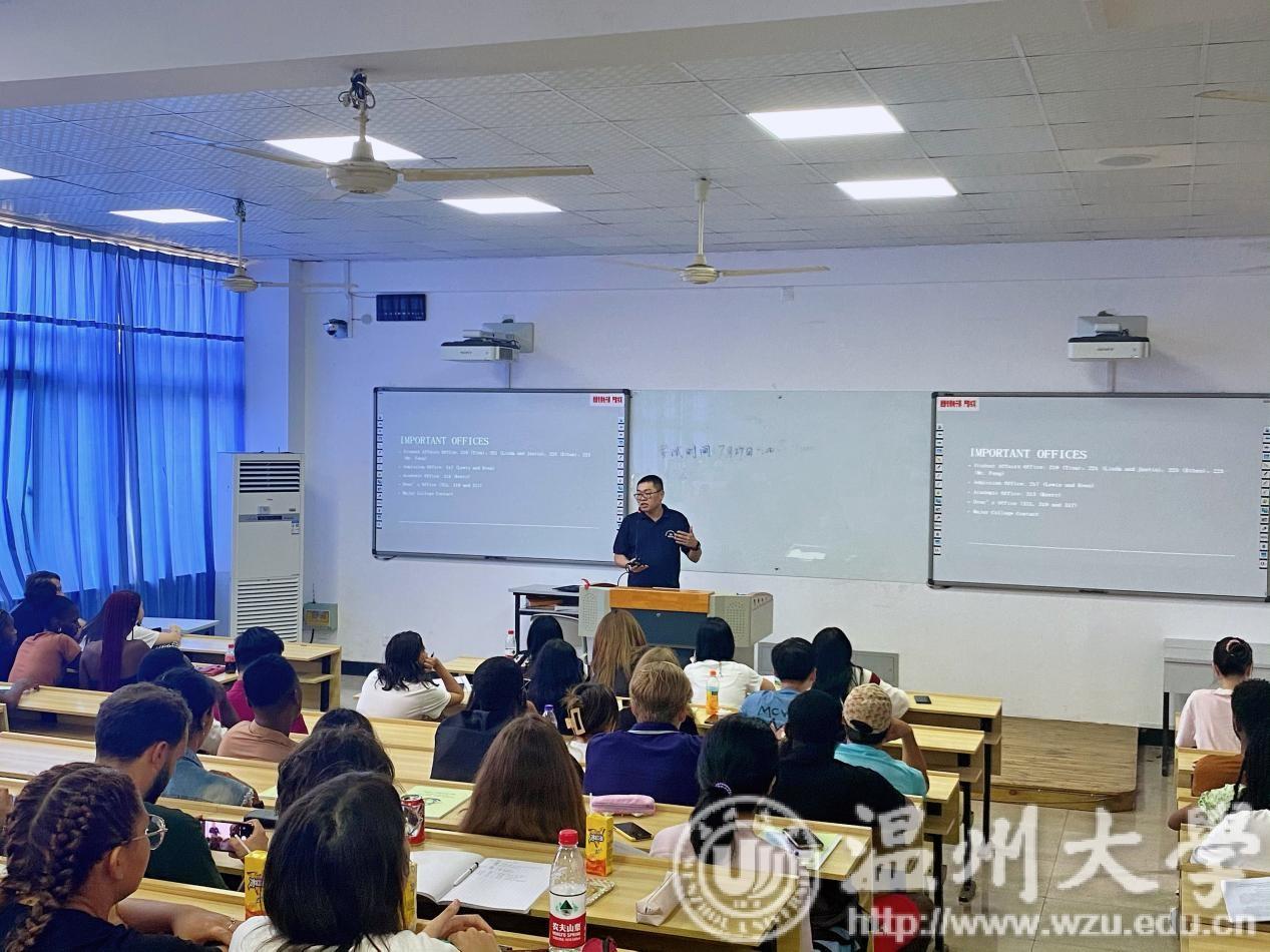 欢迎五洲四海的留学生们来到温州这片热土上;其次,宋院长分别从自然环境、特色美食、学习环境等方面介绍温大底蕴,并邀请陈梦瑶、雅库布等老生代表及夏花等新生代表分享学习体验,为新生进一步明确目标与理想起到了示范作用;最后,宋院长寄语留学生们“要像蒲公英一样,不断充盈自我,然后飞往世界各地,讲好中国故事,传播正能量,为推动构建人类命运共同体贡献青春力量”。