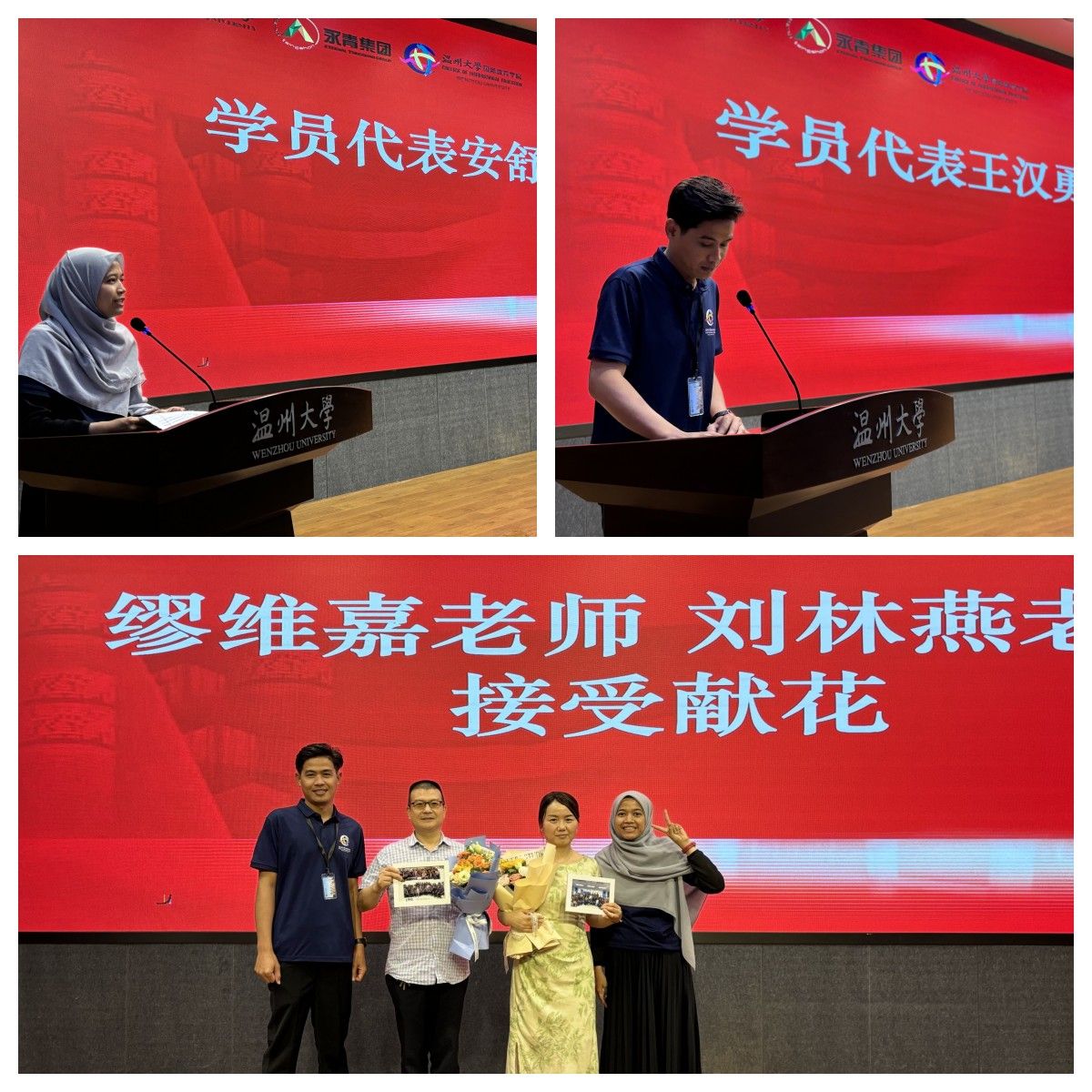 的支持与培养,表示这次学习不仅提高了他们的中文水平,也让他们深刻感受到中国传统文化的魅力和领略了中国的壮丽风景。他们表示结业并不是学习结束,而是新的起点,他们将继续努力。为了感谢班主任及任课老师的谆谆教导,两位学员代表分别给两位青山班班主任缪维嘉老师和刘林燕老师献花,表达感激之情。