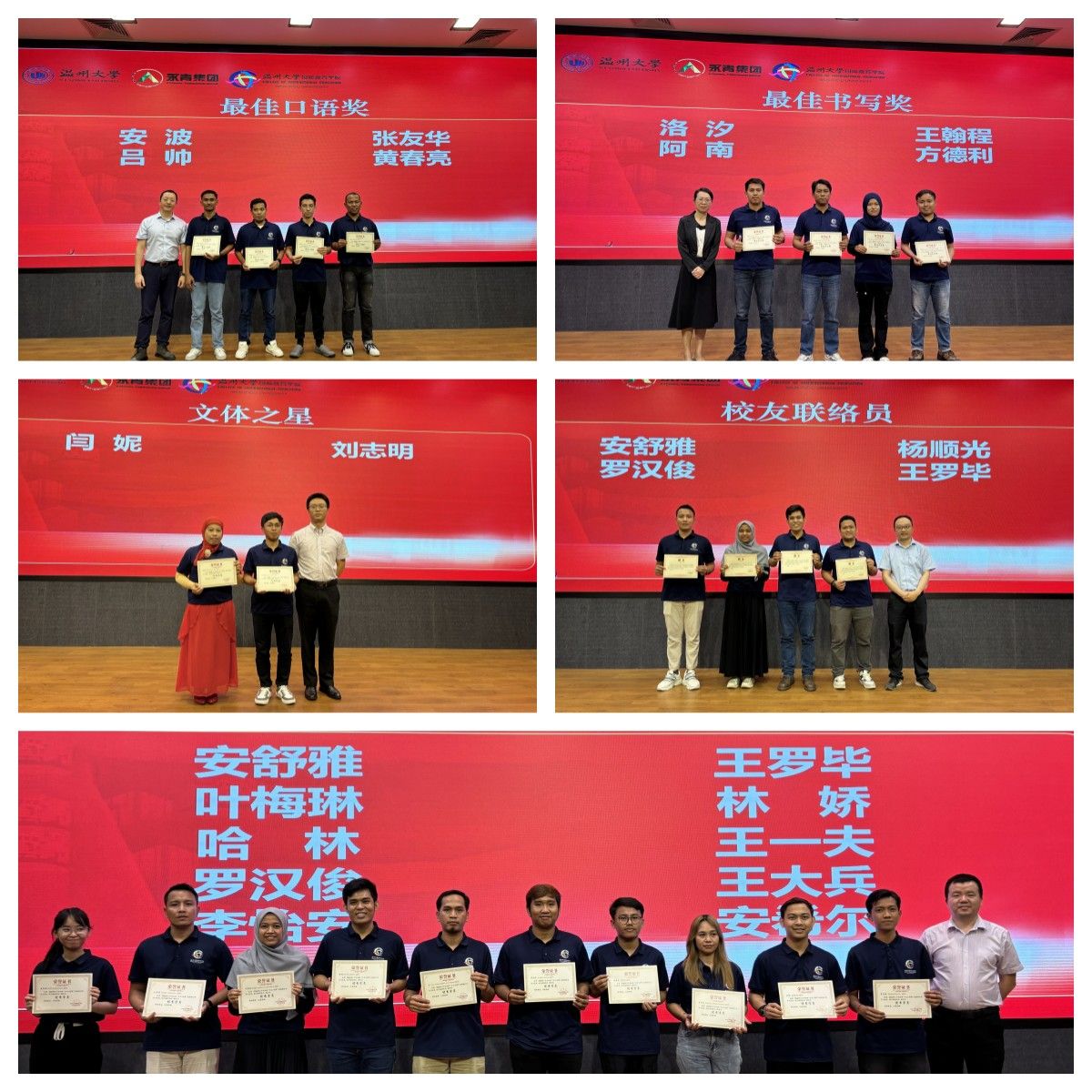 的领导们向罗汉俊等24名学员分别颁发优秀学员、最佳口语奖、最佳书写奖、文体之星、校友联络员等荣誉证书,并向全体学员颁发了结业证书,祝贺他们顺利结业。