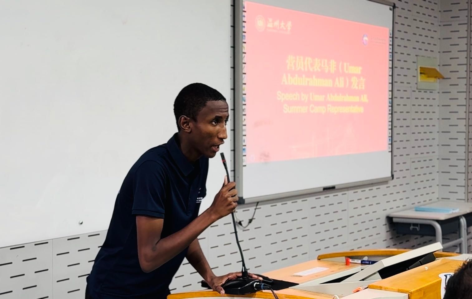 ,我们感受到了浓厚的学术氛围和热情的款待,经过10个月的中文学习,我越发感受到中文的魅力和中国文化的博大精深。我们渴望继续在这里汲取知识,结交朋友,共同成长。相信通过这次夏令营,我们将收获满满的回忆和宝贵的经验。”他的发言代表了全体营员的心声,赢得了台下阵阵掌声。