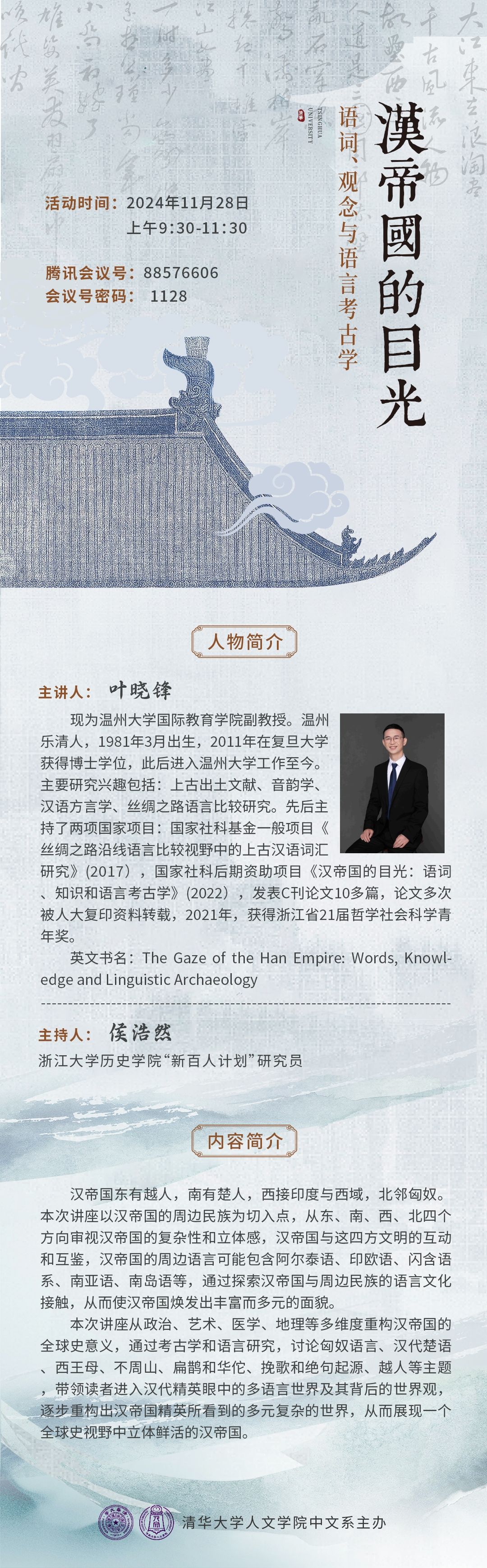 副教授叶晓锋应清华大学中文系之邀,举办了主题为《汉帝国的目光:语词、知识与语言考古学》的讲座。此讲座吸引众多清华中文系同学及线上百余名学者、研究人员参与,反响热烈。