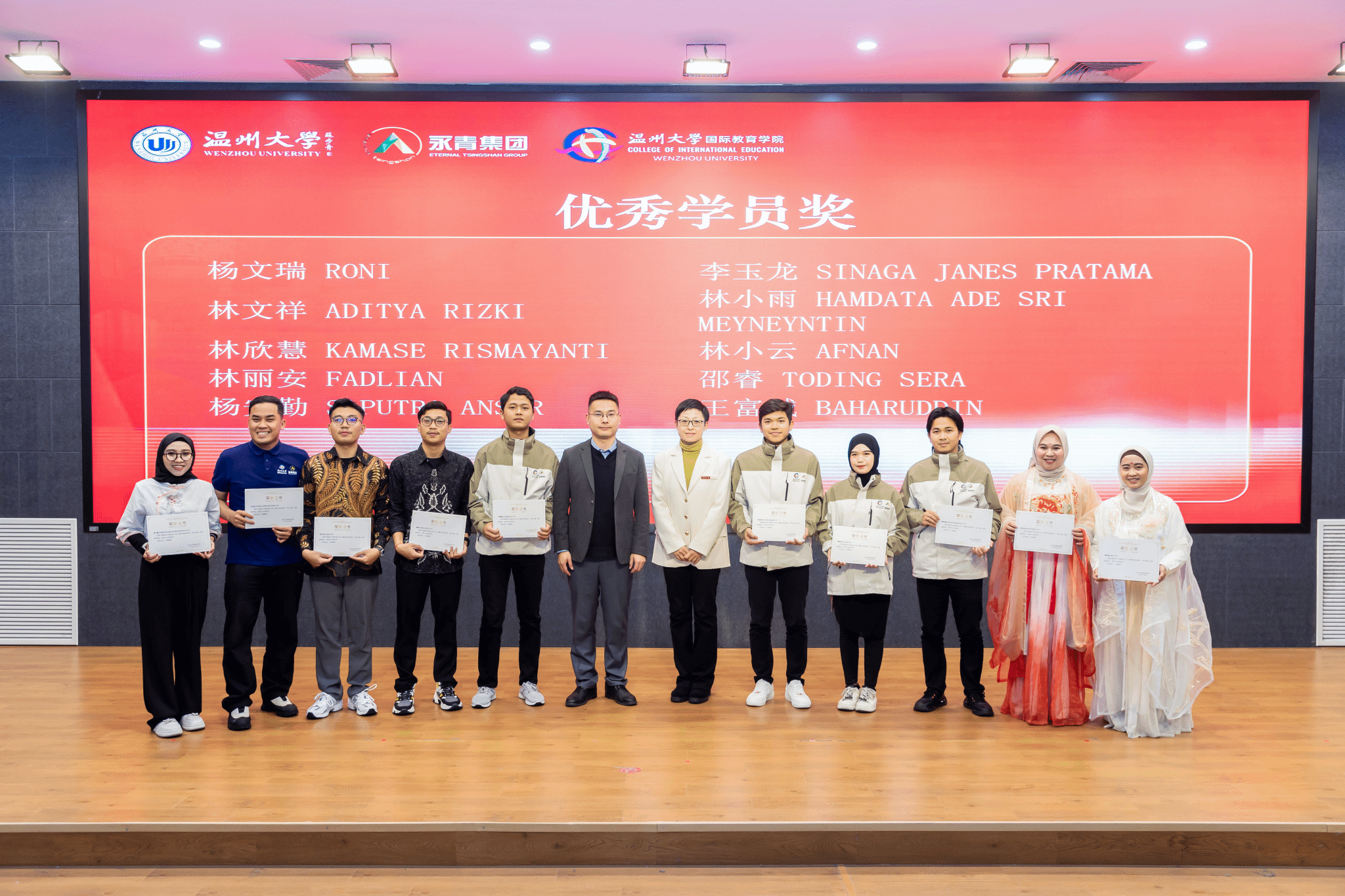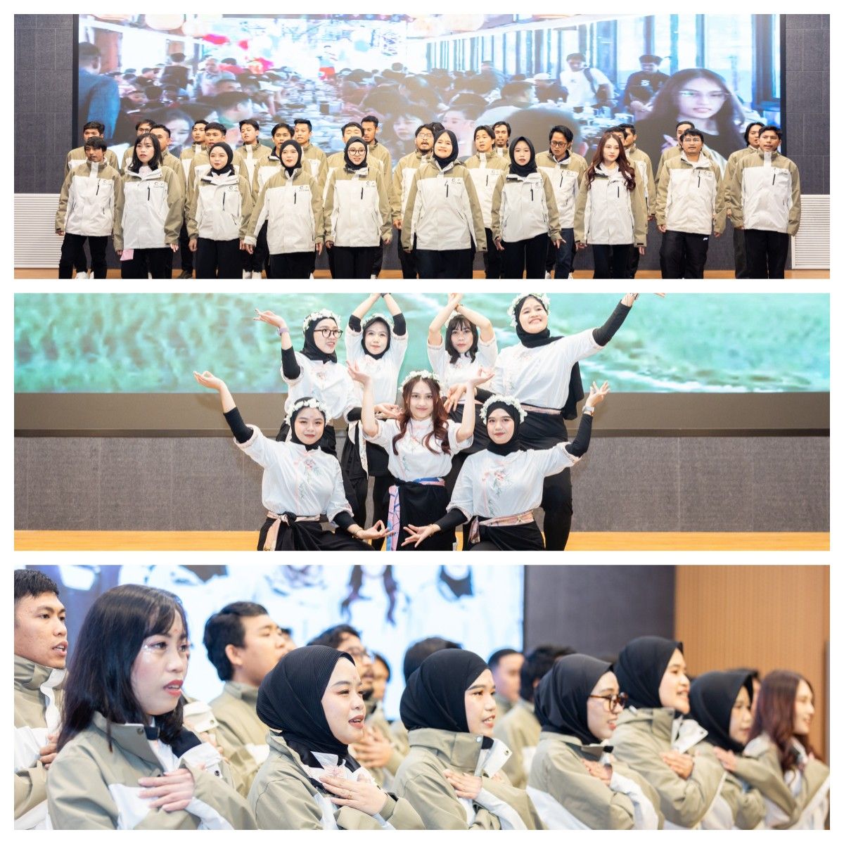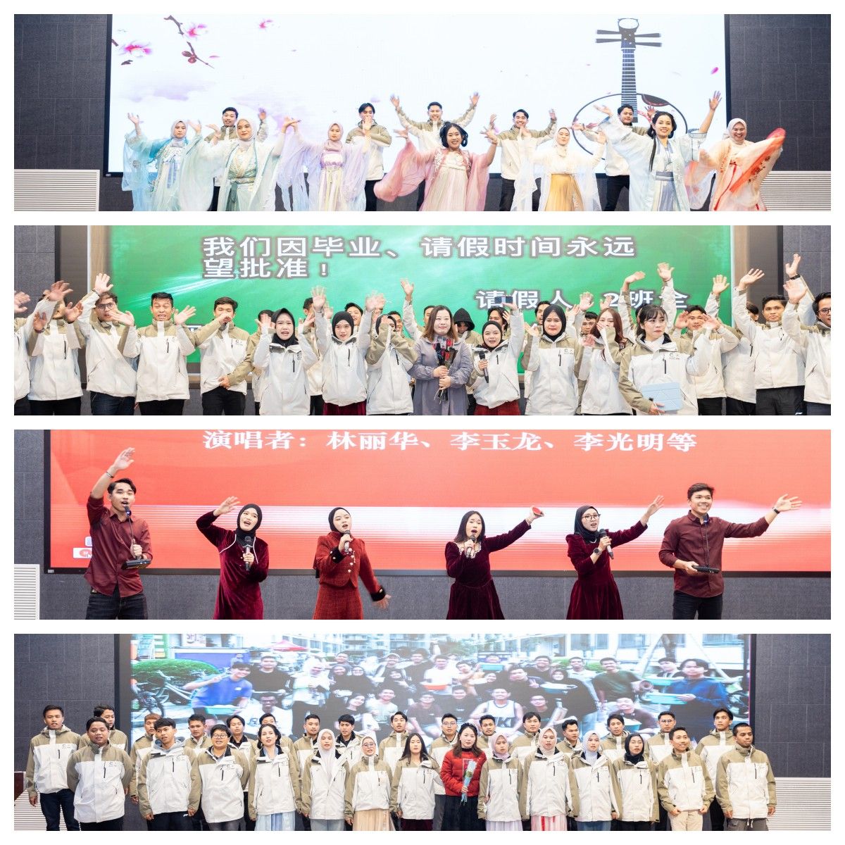 颁奖环节后,学员们开始学习成果汇报演出,包括歌曲、朗诵、舞蹈等。学员们不仅展示了汉语学习的成果,还将中国文化与印尼文化相融合,展现了不同风味的舞蹈,现场氛围热烈,欢声笑语不断。结业典礼在《再见》的合唱中缓缓落下帷幕,祝愿第三期“温大青山班”的学员们锦绣前程,一路生花!