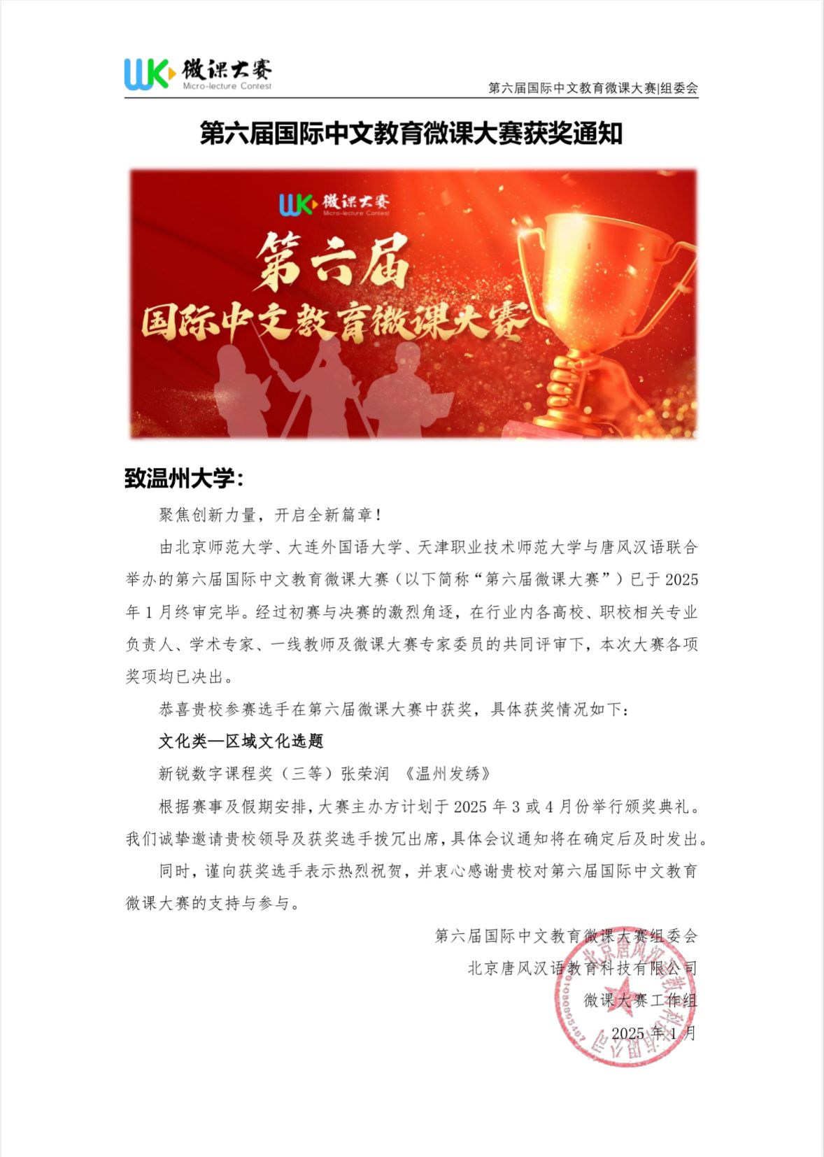 近日,由北京师范大学、大连外国语大学、天津职业技术师范大学与唐风汉语联合主办的第六届国际中文教育微课大赛圆满落幕。本届大赛吸引了来自全国240余位个人选手及120余个团体(含近700名成员)参与,提交作品逾1300件,涵盖语言教学、区域文化、中国国情等多元主题。区块链游戏 2023级研究生张荣润凭借扎实的专业知识、创新的教学理念和出色的教学技能在比赛中荣获“新锐数字课程奖(三等)”。
