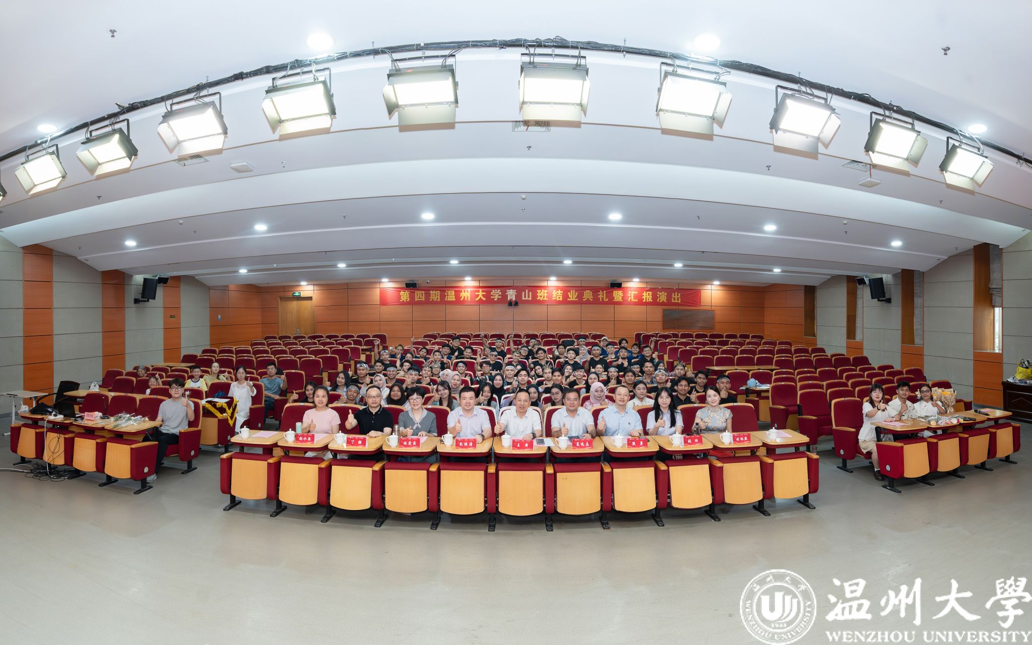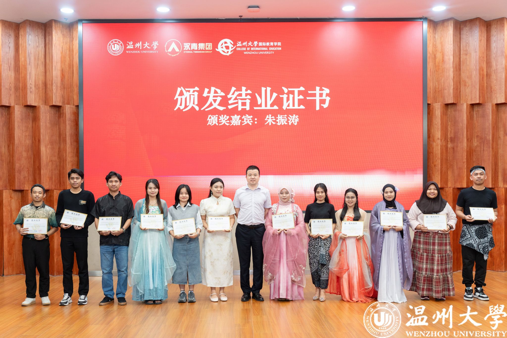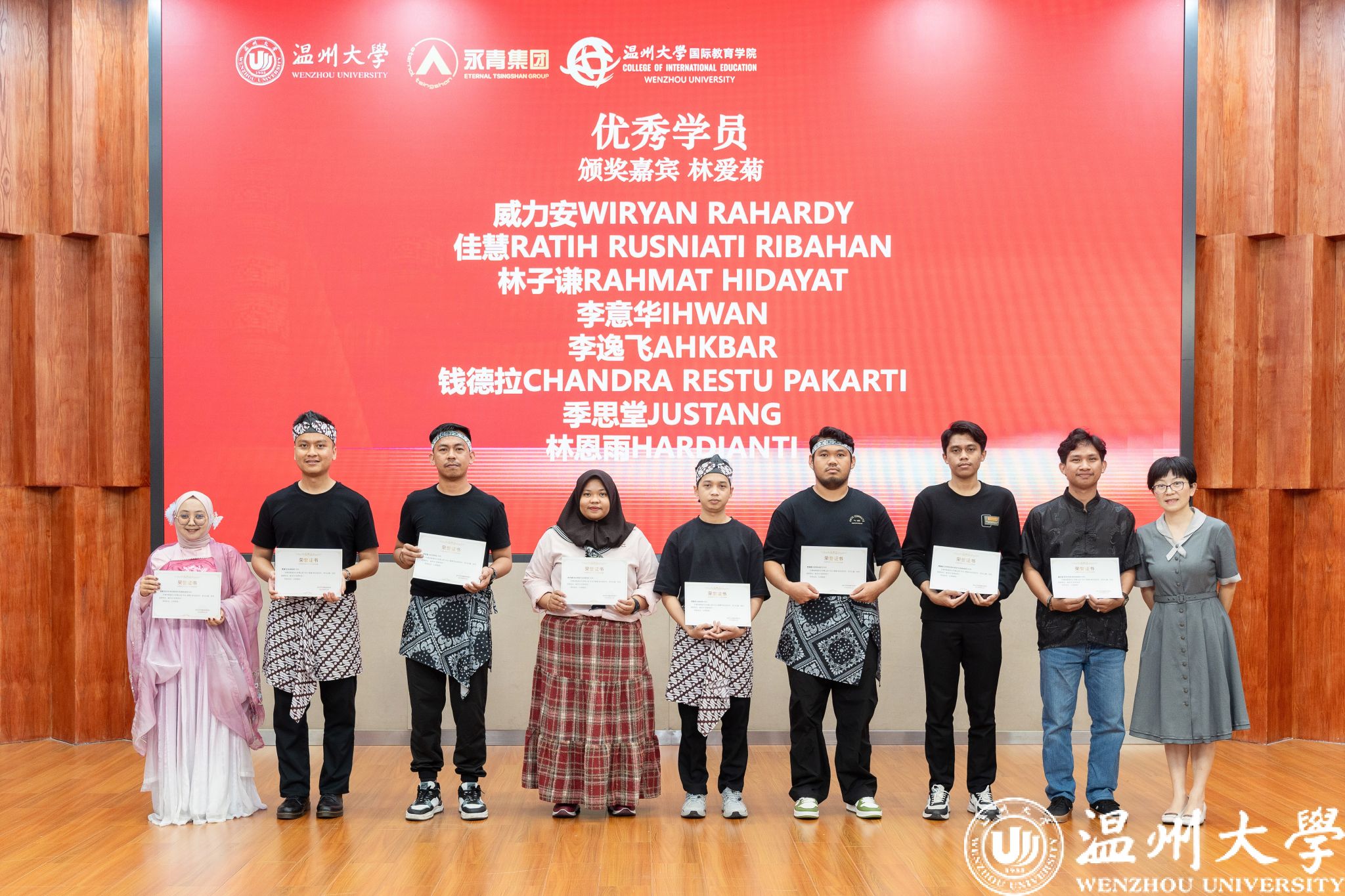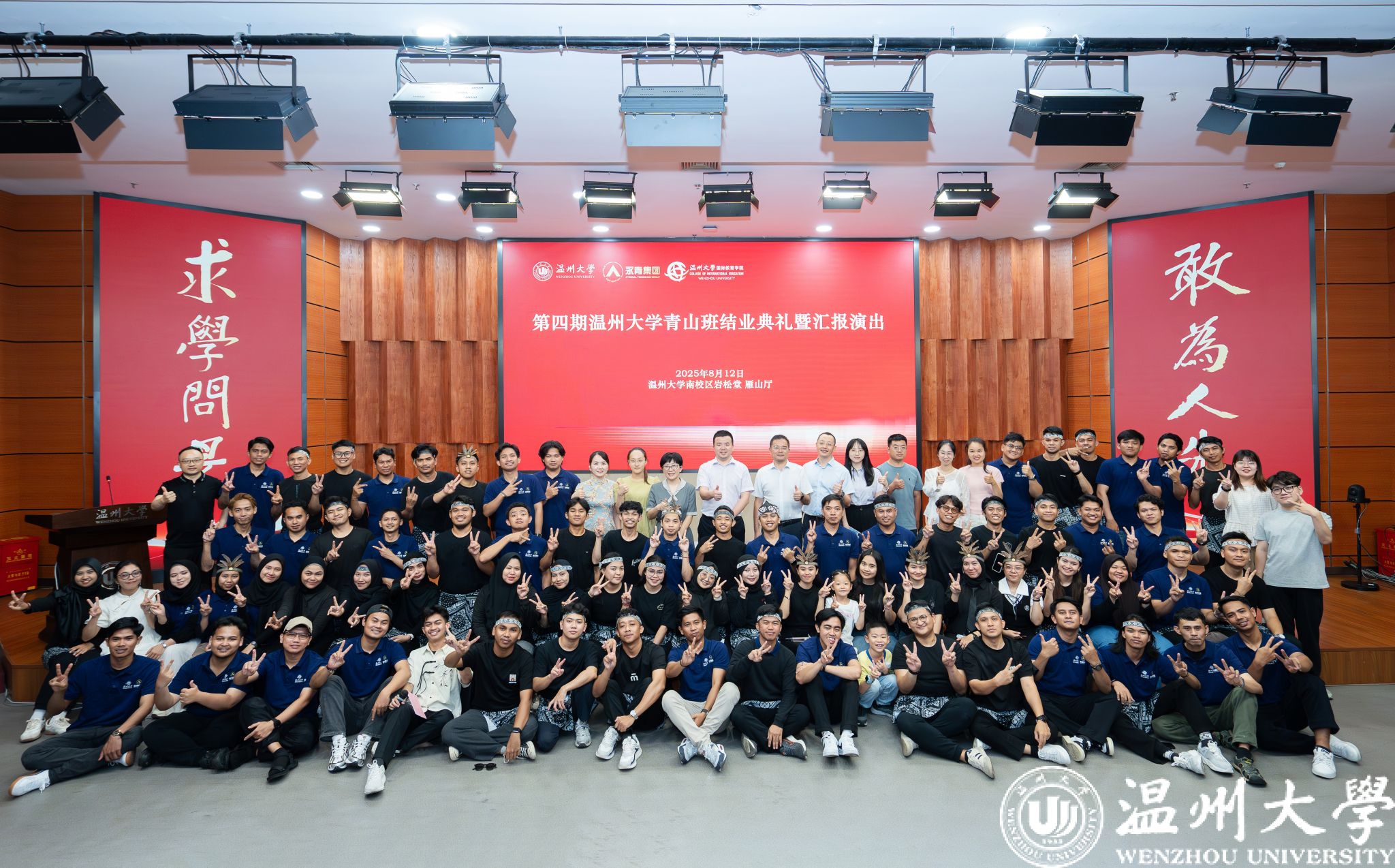 活动在全体师生合影中圆满落幕。学员们身着传统服饰,与领导、老师共同定格这一珍贵瞬间。结业不是终点,而是新的起点。未来,青山班学员将带着在温大的收获,成为中印尼经贸合作与文化交流的使者,续写更多精彩故事。